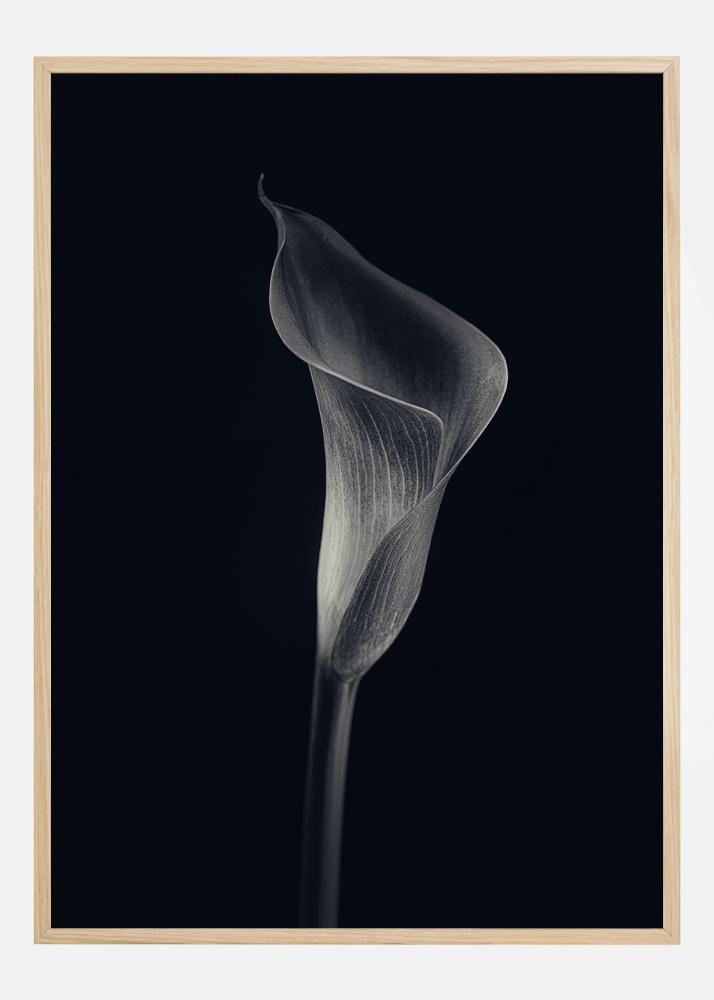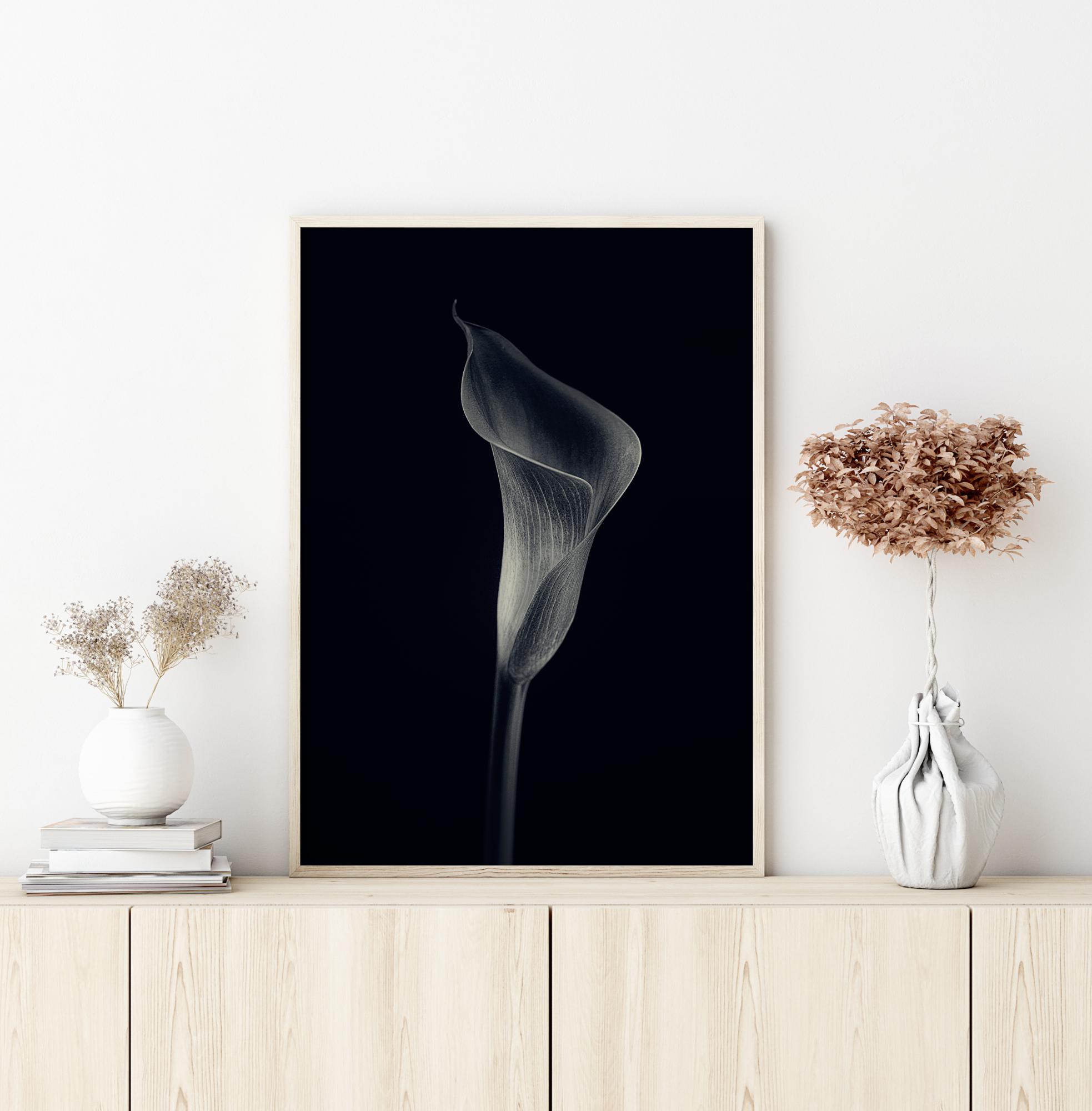 Plakat z samotną lilią, która tworzy eteryczny blask. Odwrócony negatyw tej lilii nadaje kwiatowi tajemniczość na czarnym tle. To nietypowe zdjęcie stanie się oczywistym tematem rozmów, gdy zostanie powieszone na białej ścianie dla zwiększenia efektu dramatycznego.
