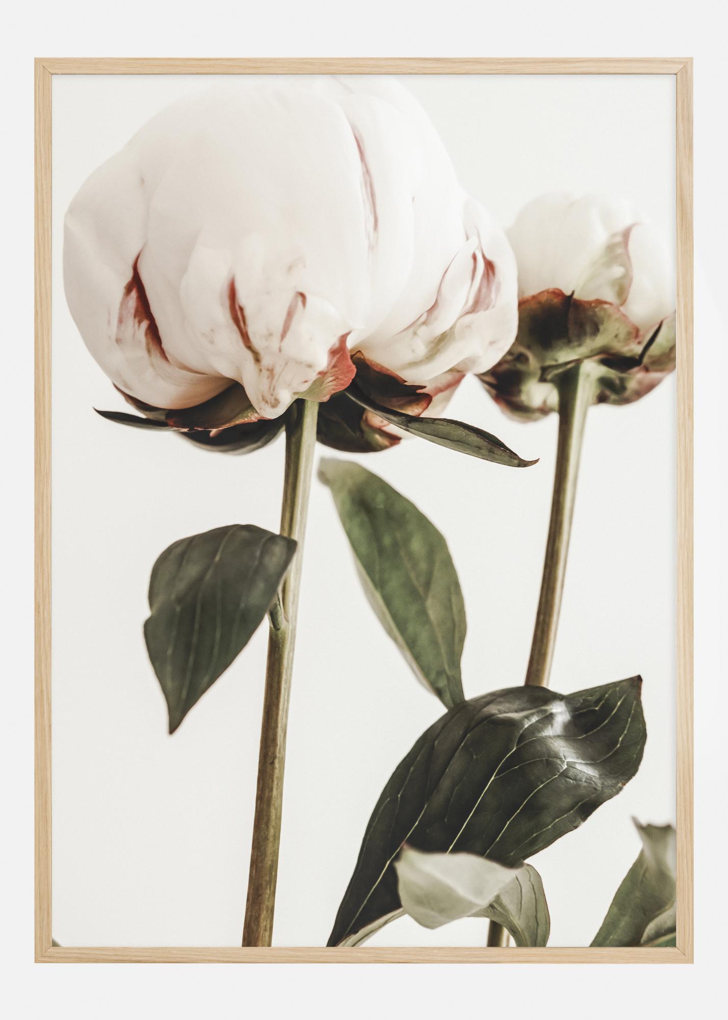 Ten plakat uchwyca wyjątkowe piękno piwonii w pełnym rozkwicie. Duże, puszyste kwiaty, z delikatnie złożonymi płatkami w odcieniach bieli i rdzawych czerwieni, dumnie stoją na swoich mocnych łodygach. Głęboko zielone liście tworzą potężne tło, które podkreśla delikatną strukturę kwiatów i bogate odcienie kolorów.