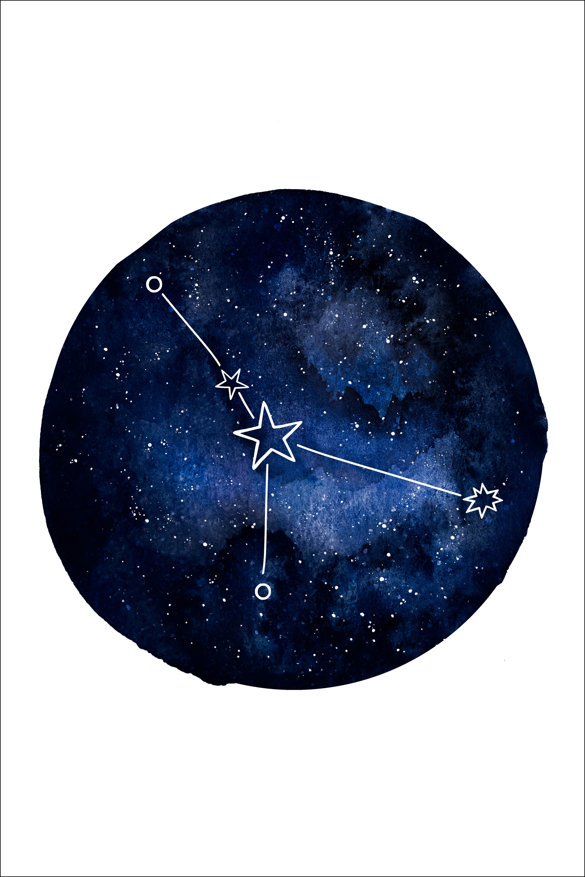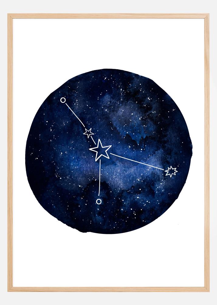 Plakat horoskopowy z znakiem Raka. Ciemnoniebieskie koło wypełnia środek tego białego obrazu. W kole znajdują się różne odcienie niebieskiego, a także różne gwiazdy. Znak zodiaku Raka jest widoczny w centrum. Jeśli kochasz swój znak zodiaku, ten obraz jest koniecznością na twojej ścianie.