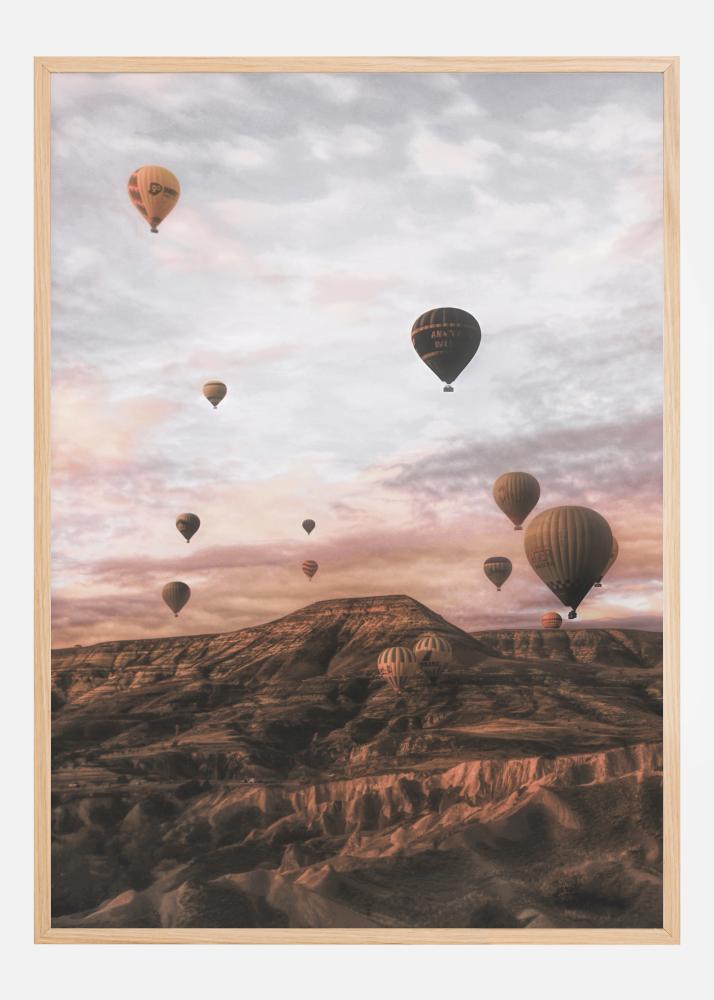 Magiczny plakat krajobrazowy z Kapadocją i balonami na ogrzane powietrze unoszącymi się w niebieskim. Miękkie różowe skały są oświetlone przez niewidzialne słońce, które również nadaje różowy blask pochmurnemu niebu. Balony na ogrzane powietrze unoszą się w górę. Poczuj podnoszące na duchu wrażenie, gdy ten plakat wisi na ścianie w domu.