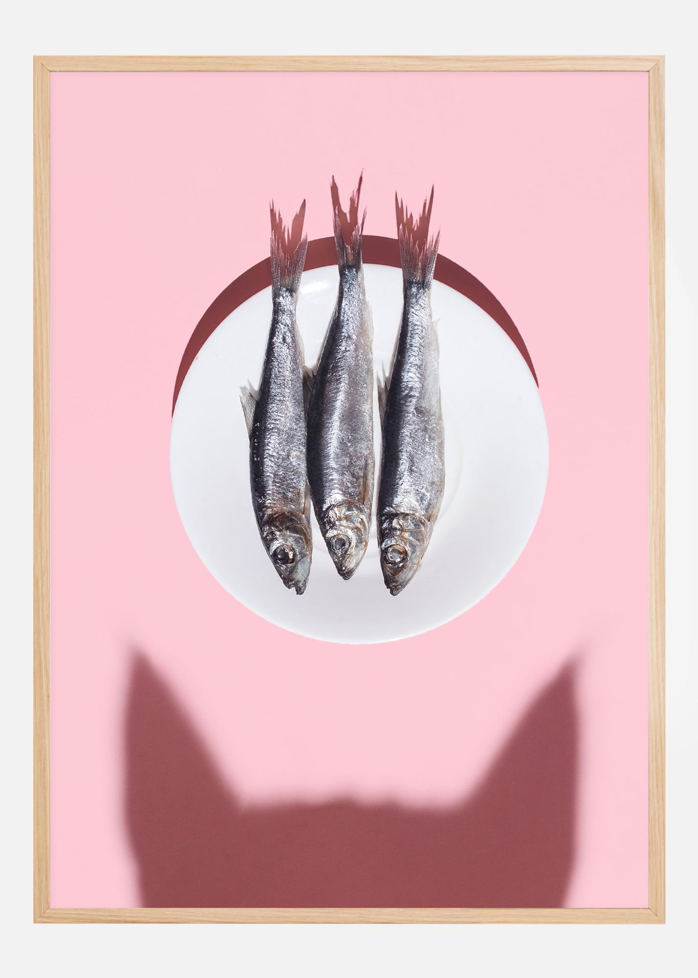 Ten artystyczny plakat przedstawia trio błyszczących ryb spoczywających na czystym białym talerzu, oferującym wyraźny kontrast do miękkiego różowego tła. Jego minimalistyczna estetyka czyni go przyciągającym wzrok dodatkiem w każdym nowoczesnym domu. Gra między czystą bielą a uspokajającym różowym tworzy obraz będący zarówno martwą naturą, jak i wyrafinowaną ozdobą projektową. Charakterystyczna sylwetka kota, stworzona za pomocą światła i cienia, dodaje zabawny i kreatywny akcent do motywu, zapewniając, że ten plakat stanie się tematem rozmów.