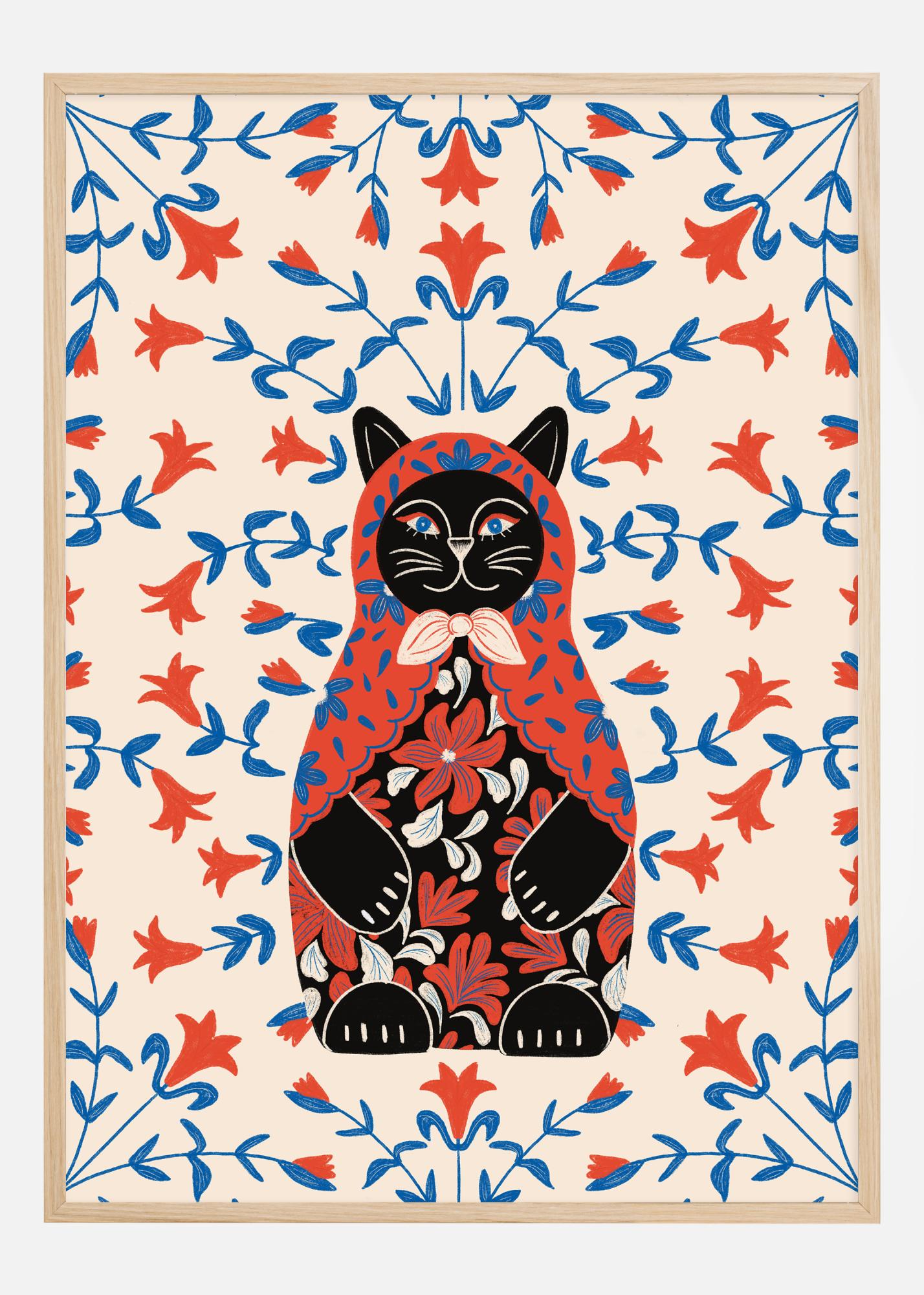 Ten kolorowy i żywy plakat jest nowoczesną interpretacją klasycznej rosyjskiej matrioszki, przedstawioną jako majestatyczna figura kota siedzącego w centrum, otoczona bujnym ogrodem kwiatowym. Spojrzenie kota jest przenikliwe i tajemnicze, a jego futro bogato zdobione misternymi wzorami kwiatowymi. Wokół kota rozciąga się morze czerwonych i niebieskich kwiatów na kremowym tle, co tworzy niemal hipnotyzujący wzór, który jest zarówno fascynujący, jak i piękny.