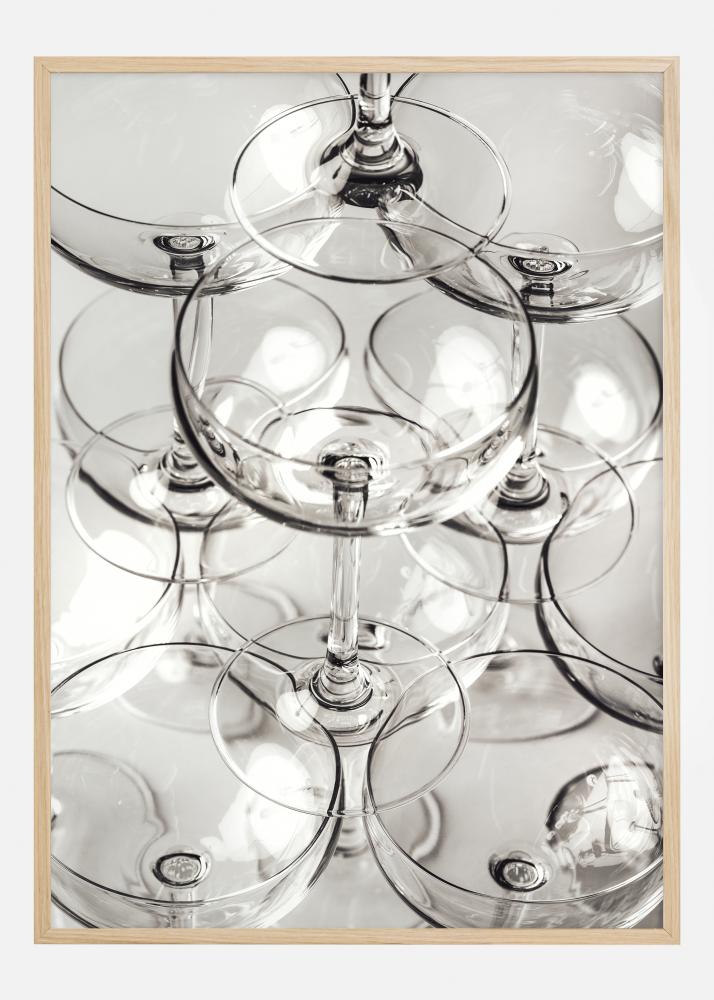 Ten elegancki i wyrafinowany plakat uchwyca piękno i klarowność kaskady kieliszków szampańskich. Obraz przedstawia zbliżenie kunsztownej struktury szkła, gdzie światło odbija się i załamuje przez przezroczysty materiał, tworząc taniec światła i cieni. Bogactwo detali i delikatna precyzja kompozycji podkreślają delikatne kształty kieliszków i subtelne odcienie szkła.