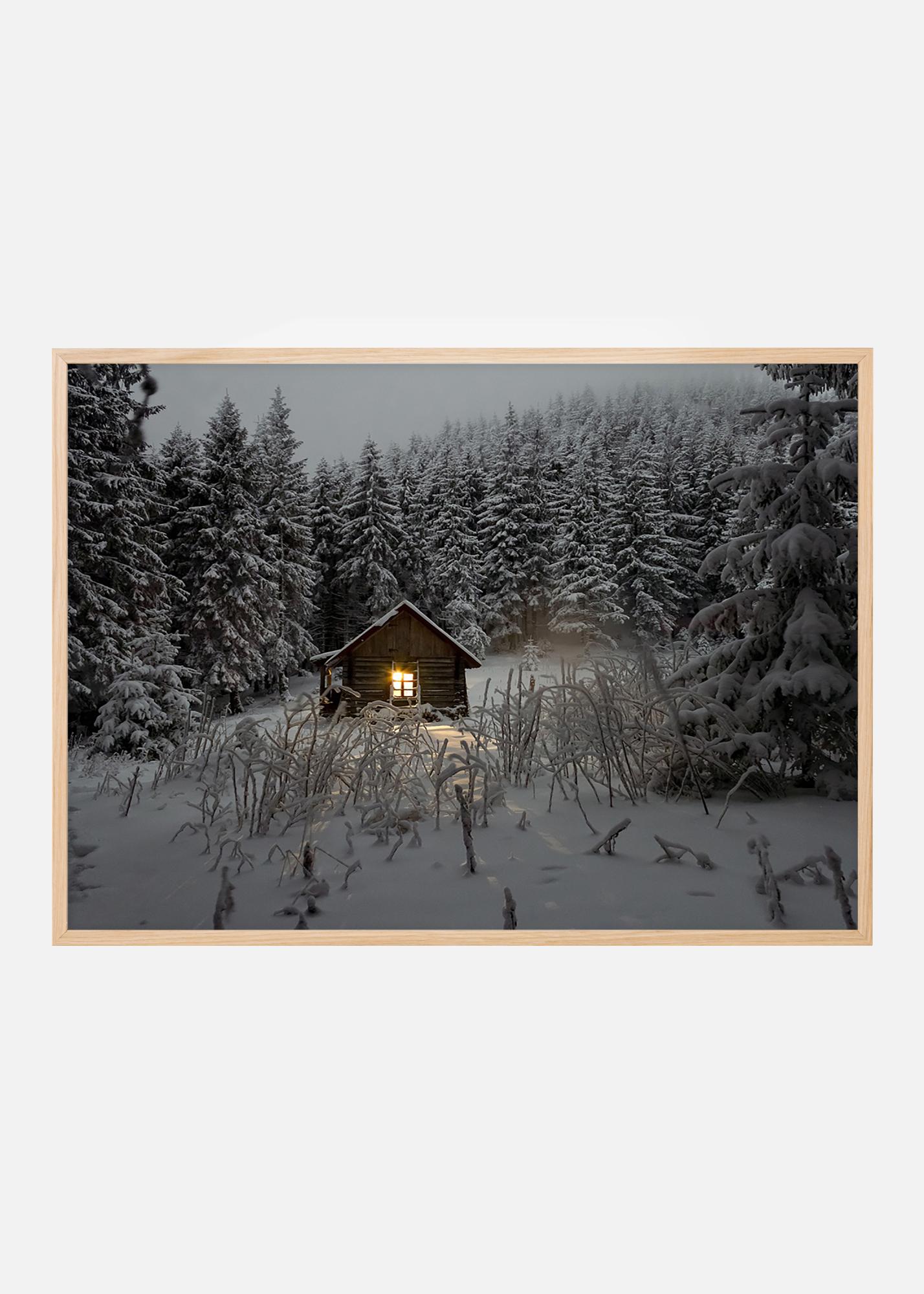 Plakat z uroczą małą chatką w zimowej szacie, głęboko w świerkowym lesie. Światło z okna, które rozjaśnia mroźną zimową noc, nadaje fotografii głębi i sprawia, że obraz staje się interesujący. Obraz pasuje do każdego stylu wnętrza i otoczenia. Wygląda równie pięknie w cienkiej czarnej metalowej ramie, jak i w masywniejszej wersji z drewna, albo dlaczego by nie podkreślić światła na obrazie w klasycznej złotej ramie.