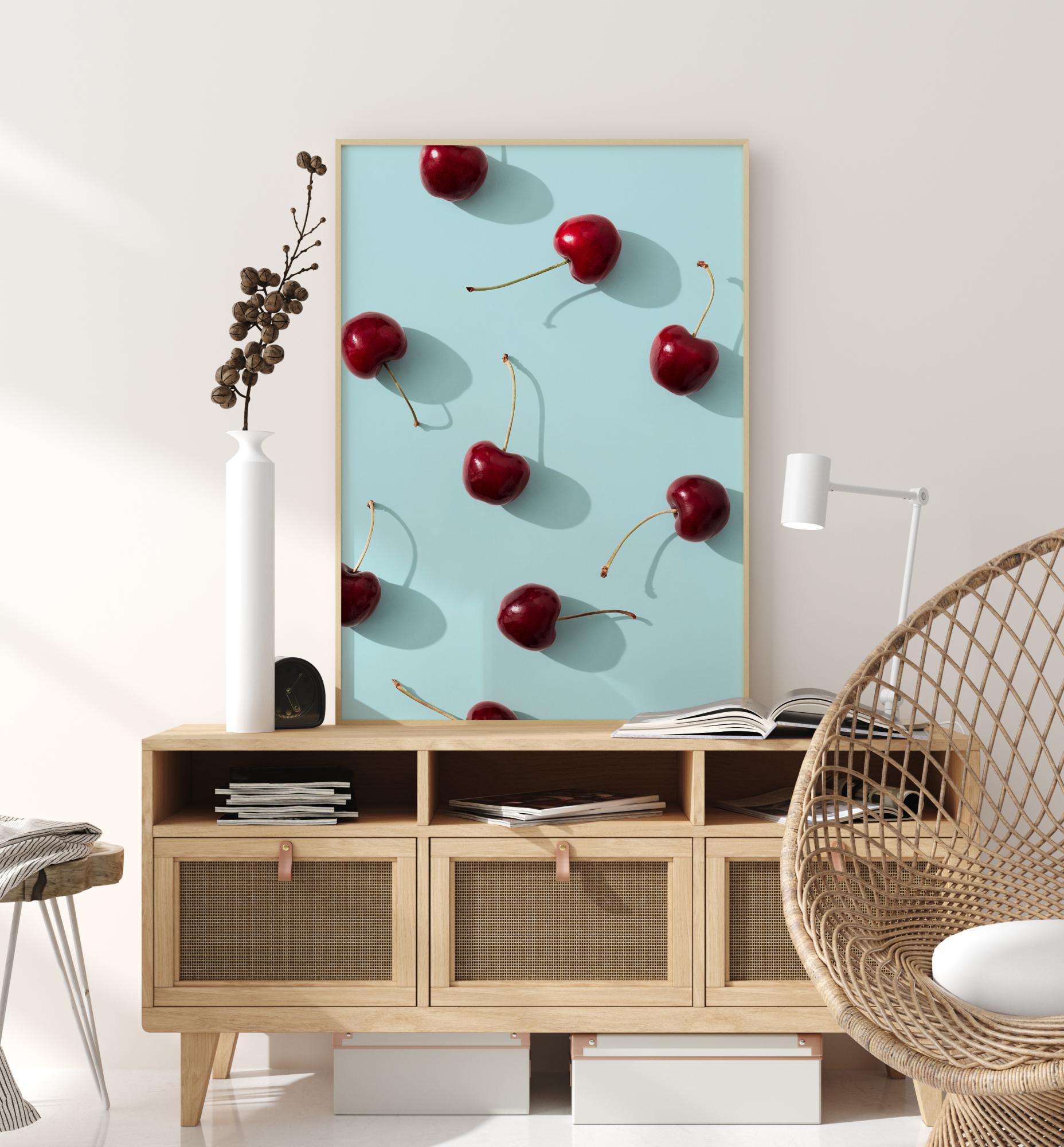 Plakat owocowy z ośmioma wiśniami na delikatnym niebieskim tle. Jasnoczerwone wiśnie i ich łodygi rzucają cienie na prosty turkusowy blat, na którym leżą. Przypomnij sobie o pięciu porcjach dziennie dzięki temu soczystemu obrazowi wiszącemu w twojej kuchni.