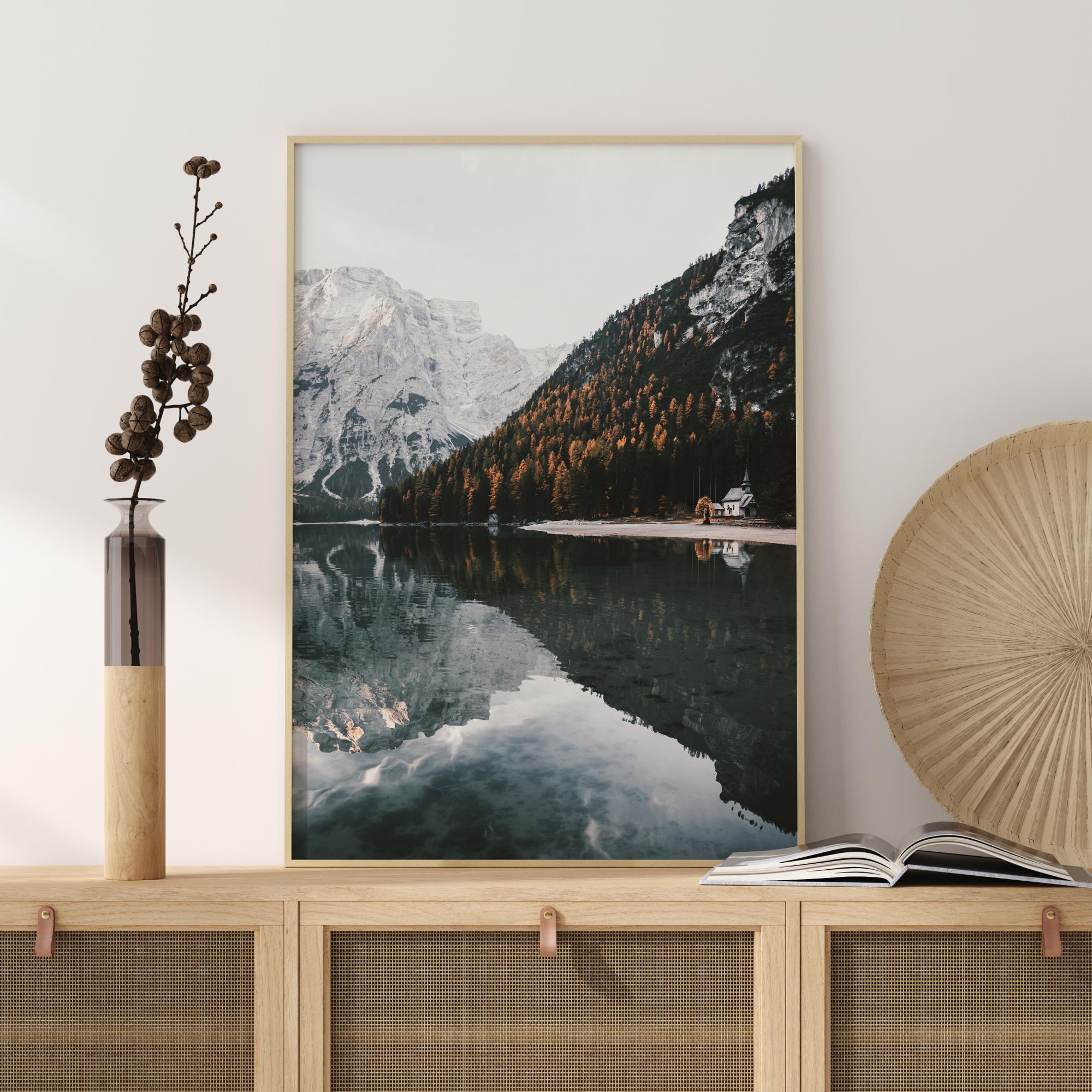 Epicki plakat przedstawiający górską scenę z małym kościołem położonym w lesie. Ciesz się wspaniałością tego śnieżnego krajobrazu, gdzie góry odbijają się w spokojnym jeziorze. Jesiennie żółte drzewa otaczają góry, a mały biały kościół stoi u podnóża. Zainspiruj się, patrząc na cuda natury.