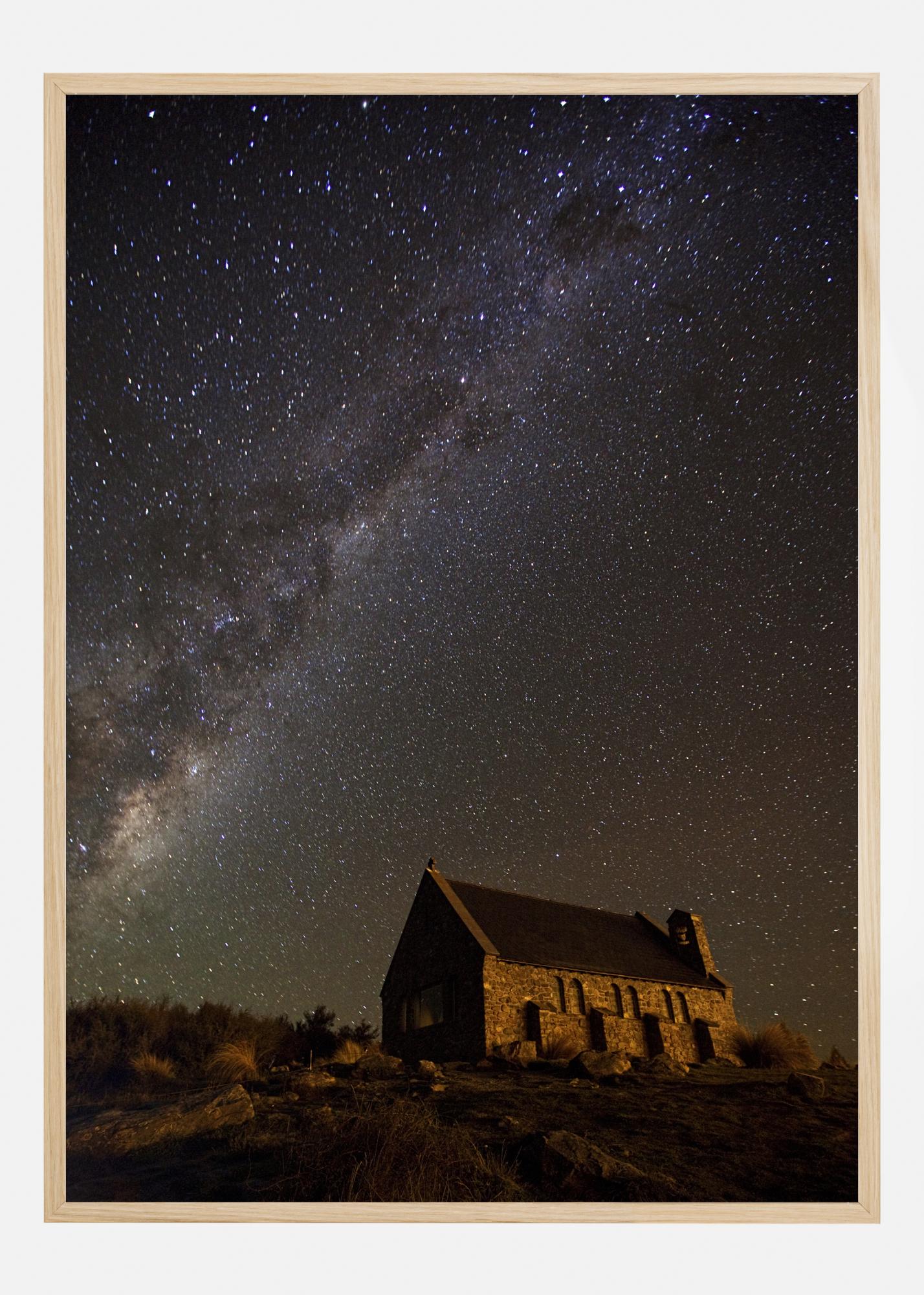 Religijny plakat przedstawiający starą kamienną cerkiew z Drogą Mleczną w tle. Rustykalna cerkiew jest oświetlona miękkim światłem na wzgórzu. Jasne niebo nocne jest wypełnione małymi gwiazdami tworzącymi naszą galaktykę powyżej. Poczuj respekt wobec naszego wszechświata na tym obrazku.