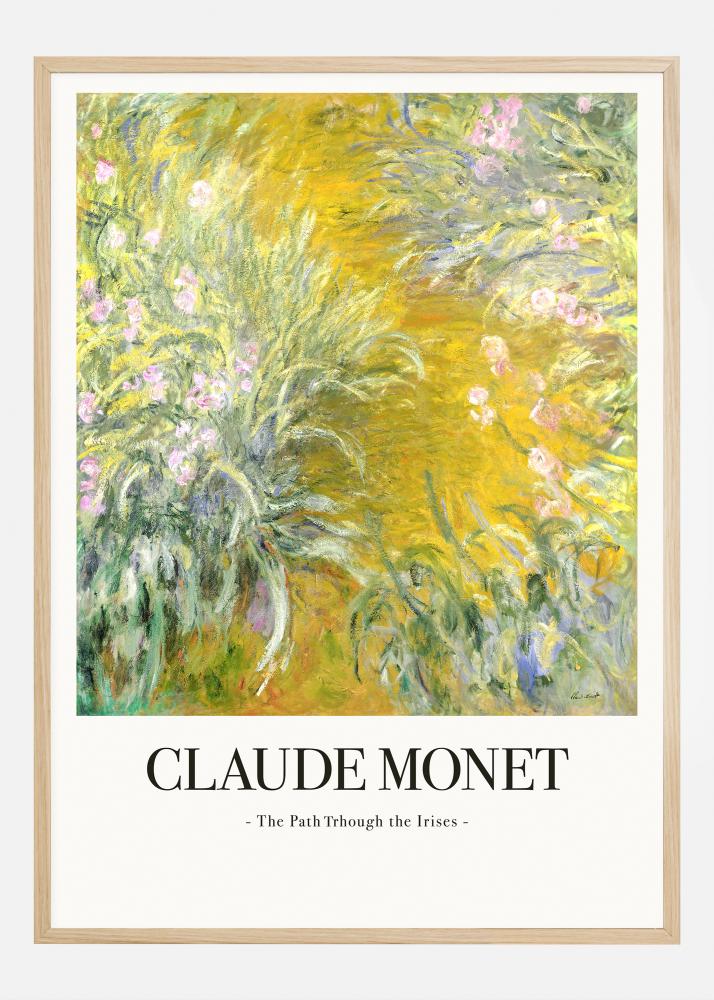 Tytuł plakatu, 'Ścieżka przez irysy', wprowadza nas w wizję ogrodu Claude'a Moneta, miejsca, które dostarczało mu nieskończonej inspiracji. Ten obraz, pulsujący żywymi żółtymi i zielonymi tonami, uzupełniony charakterystycznymi fioletowymi i różowymi irysami, przyciąga wzrok obserwatora i zaprasza na spacer niewidzialną ścieżką. Podpis Moneta jest dyskretnie umieszczony w rogu, co wzmacnia autentyczność dzieła sztuki i jego historyczne znaczenie.
