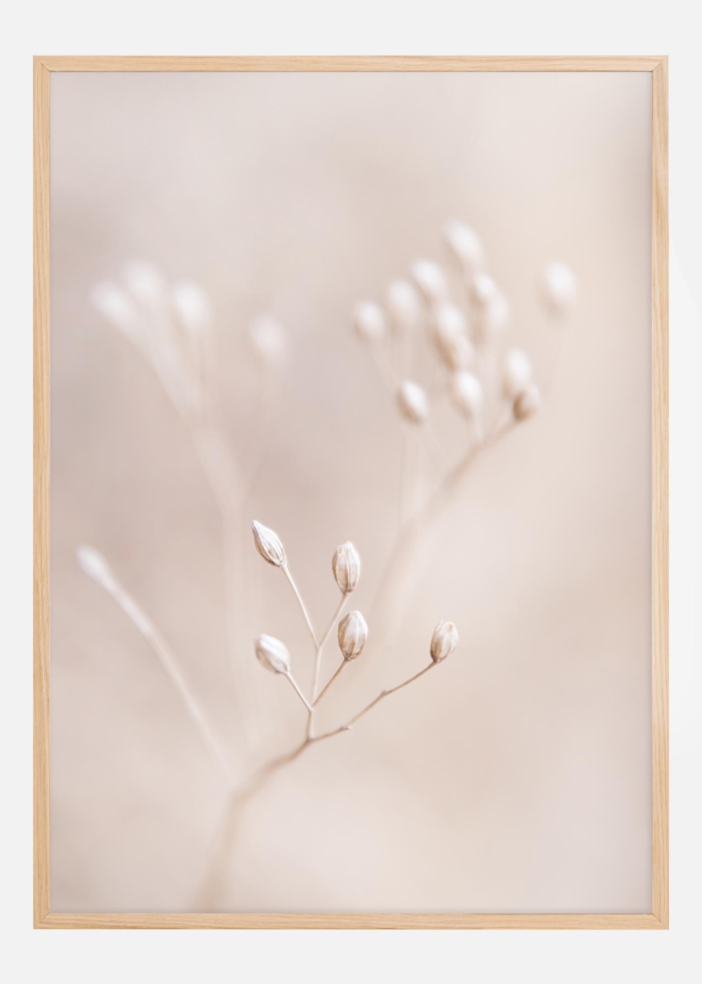 Ten plakat uchwyca piękno prostoty poprzez zbliżenie fotografii źdźbła trawy i pączków w delikatnym beżowym odcieniu. Rozmyte tło nadaje fotograficznej pracy marzycielskiej jakości, podkreślając delikatną strukturę źdźbła i piękne detale pączków. Jest to hołd dla cichej elegancji natury, który niesie ze sobą poczucie spokoju i ciepła.