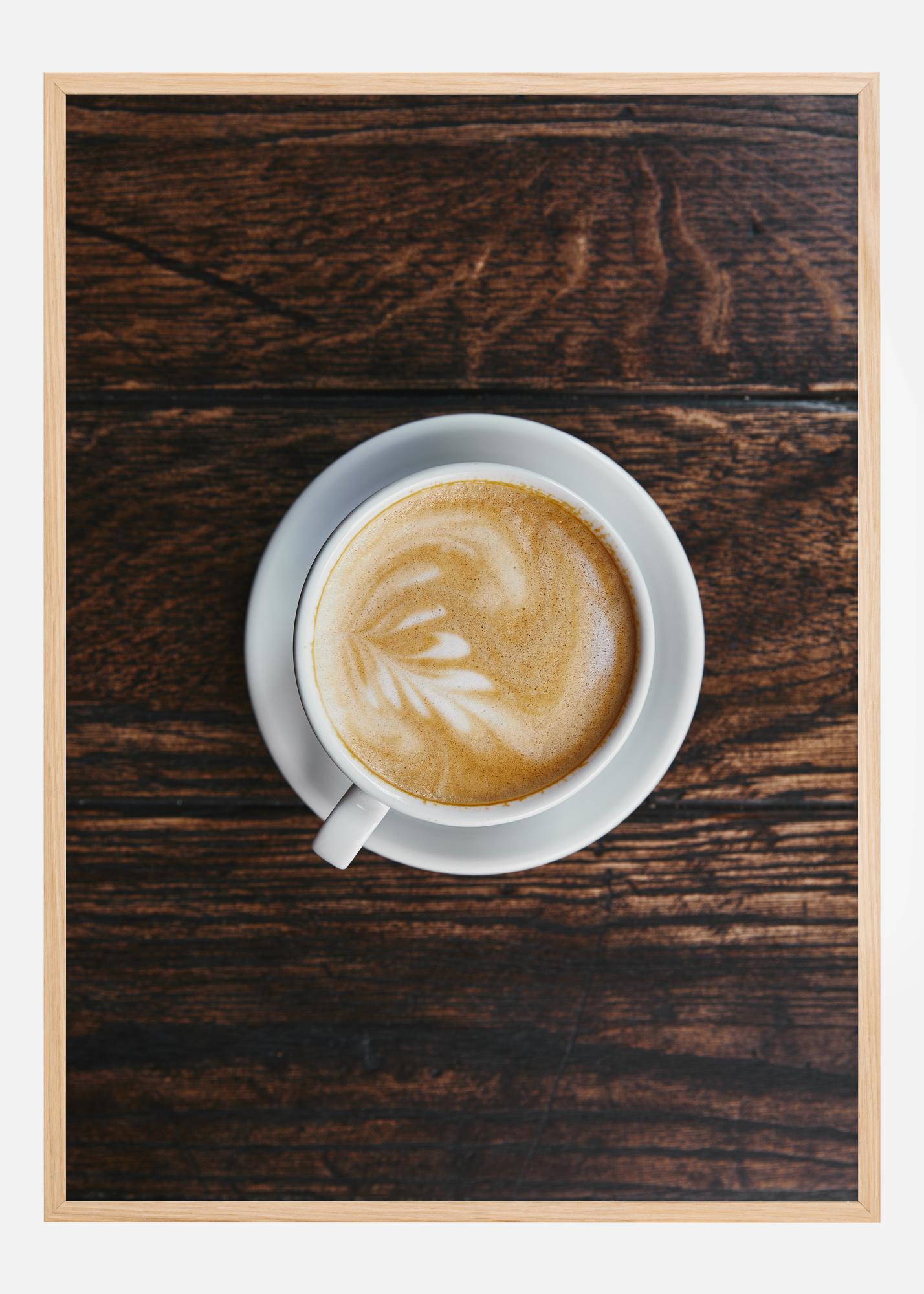 Ten przyjazny i rozgrzewający plakat jest hołdem dla kultury kawy i doskonałym wyborem dla każdego miłośnika kawy. Widok z góry na klasyczną białą filiżankę kawy na ciemno-brązowej powierzchni drewnianej przekazuje natychmiastowe poczucie komfortu i przerwy w codzienności. Pianka na kawie ma piękny wzór artystyczny, który zachęca do chwili relaksu i przyjemności.