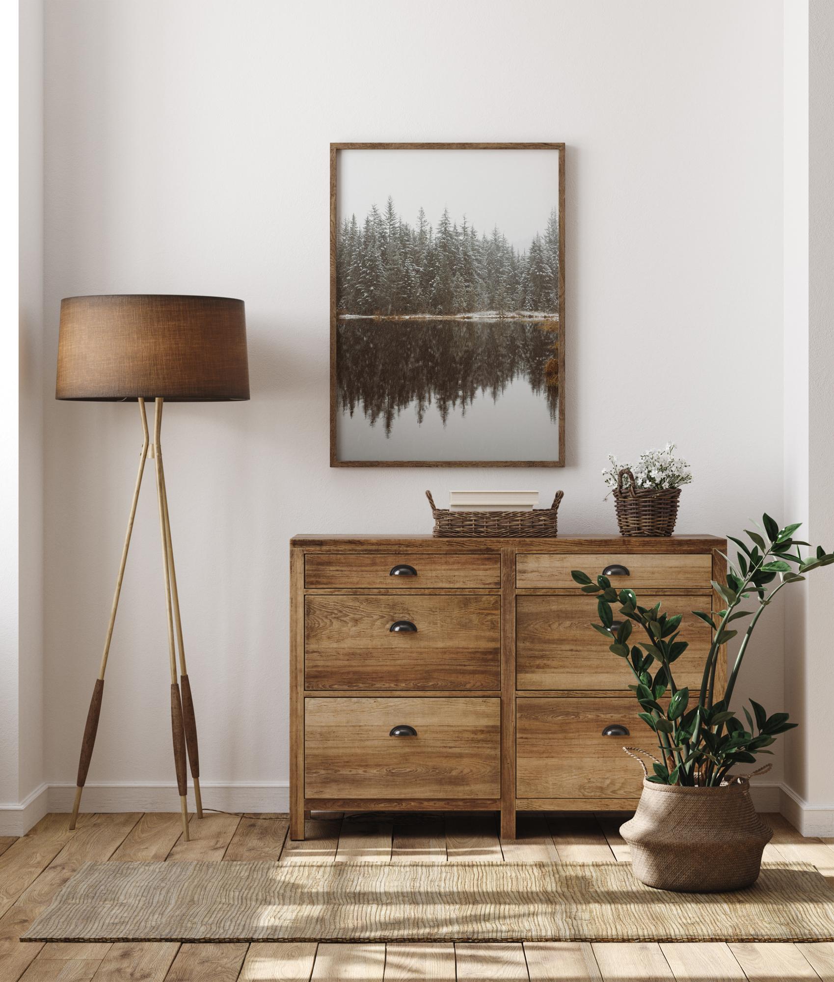 Plakat świąteczny z ośnieżonymi świerkami na brzegu jeziora. Drzewa świerkowe rzucają idealne odbicia w jeziorze, tworząc spokojny, ale jednocześnie chłodny pejzaż. Wprowadź zimę do swojego domu dzięki temu przepięknemu zdjęciu przyrody i ciesz się ciepłem wewnątrz.