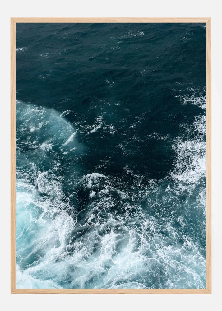Plakat morski z falami uderzającymi i wirującymi na otwartym morzu. Biała piana wiruje wokół dolnej krawędzi obrazu, nadając mu spokojniejszy odcień ciemnego akwamarynu. Wyobraź sobie, że jesteś w łodzi na falach, korzystając z tego fantastycznego obrazu.