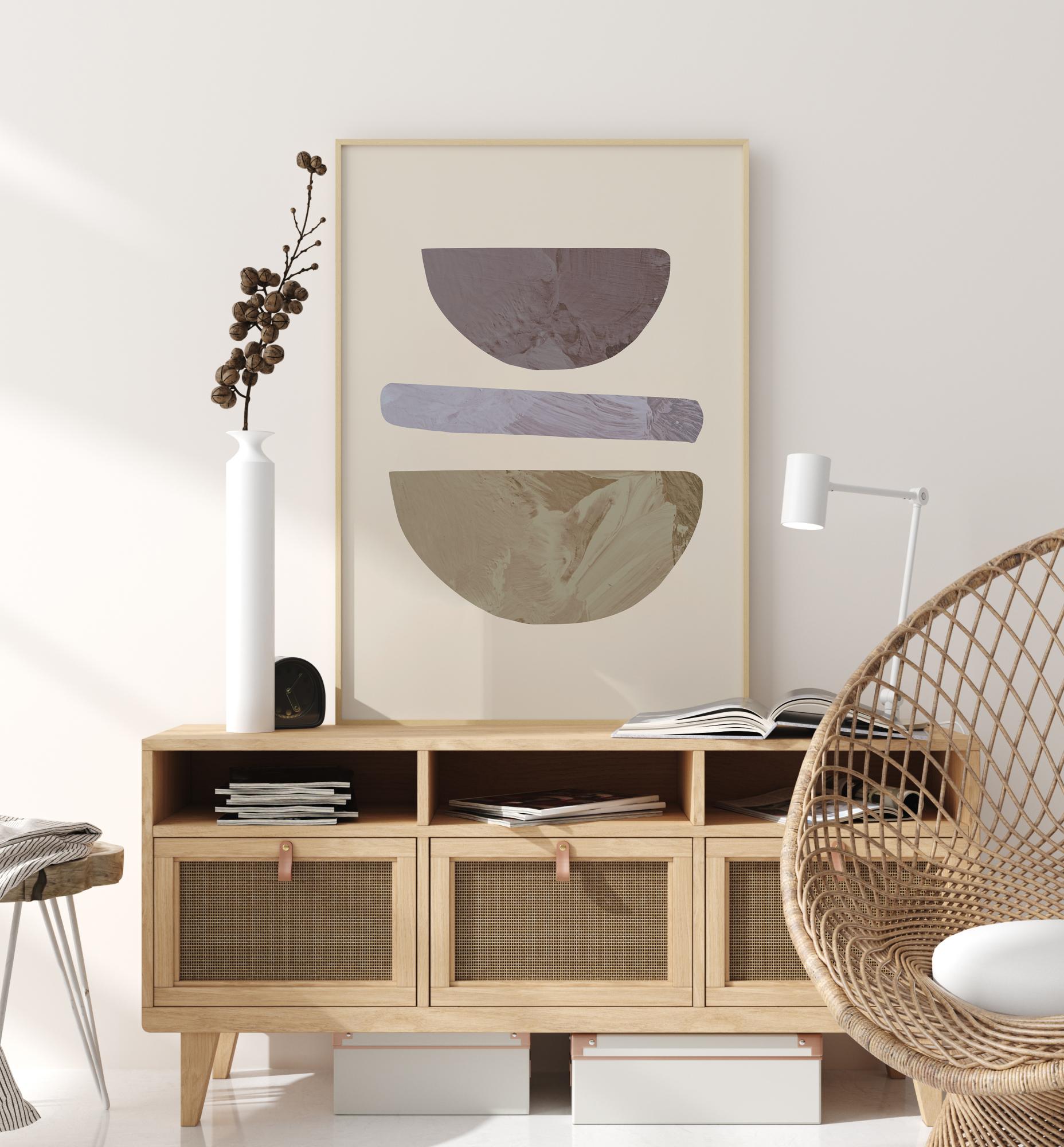 Abstrakcyjny plakat z trzema wyrazistymi formami w różnych kolorowych paskach. Duża, kremowa i beżowa półokrągła forma znajduje się na dolnej krawędzi, a cienki niebieski pasek nad nią. Na górnej krawędzi znajduje się druga półokrągła forma w kolorze szarym i niebieskim. Kiedy powiesisz ten obrazek w swojej domowej hali, stanie się oczywistym tematem rozmowy.