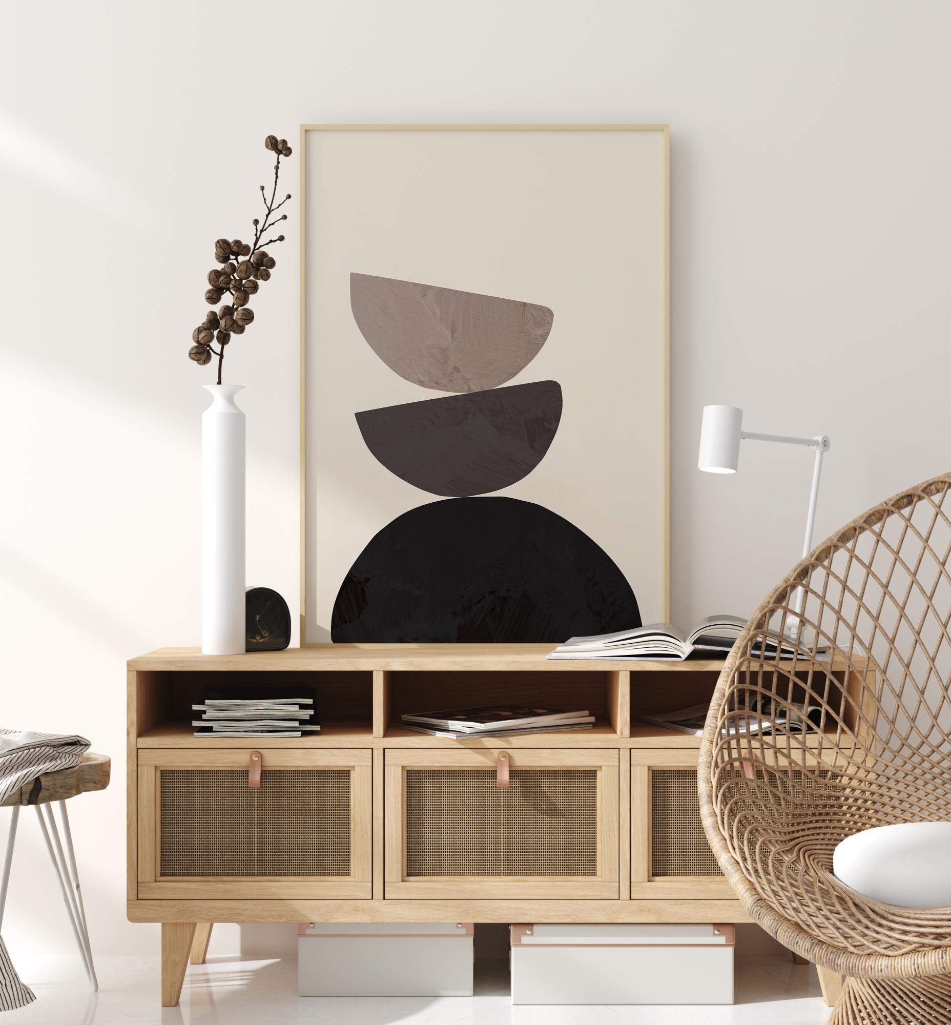 Prosty abstrakcyjny plakat z trzema różnymi półokręgami. Każdy półokrąg ma indywidualny odcień szarości, zaczynając od czerni na dole i przechodząc do jasnoszarego na górze. Wzajemnie się równoważą, co nadaje dziełu poczucie dokładnej stabilności.