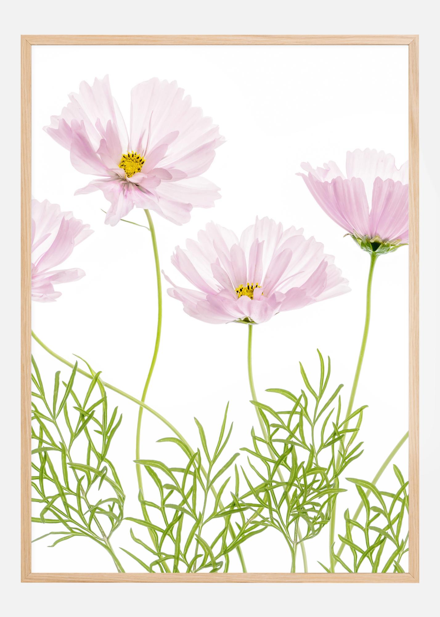 Plakat w stylu drukarskim z kosmosami. Każdy kwiat jest miękko liliowo-różowy z jasnożółtym środkiem. Proste zielone liście prowadzą wzrok do tych tańczących kwiatów. Uzyskaj kapryśne wrażenie dzięki temu fantastycznemu wzorowi w swoim domu.