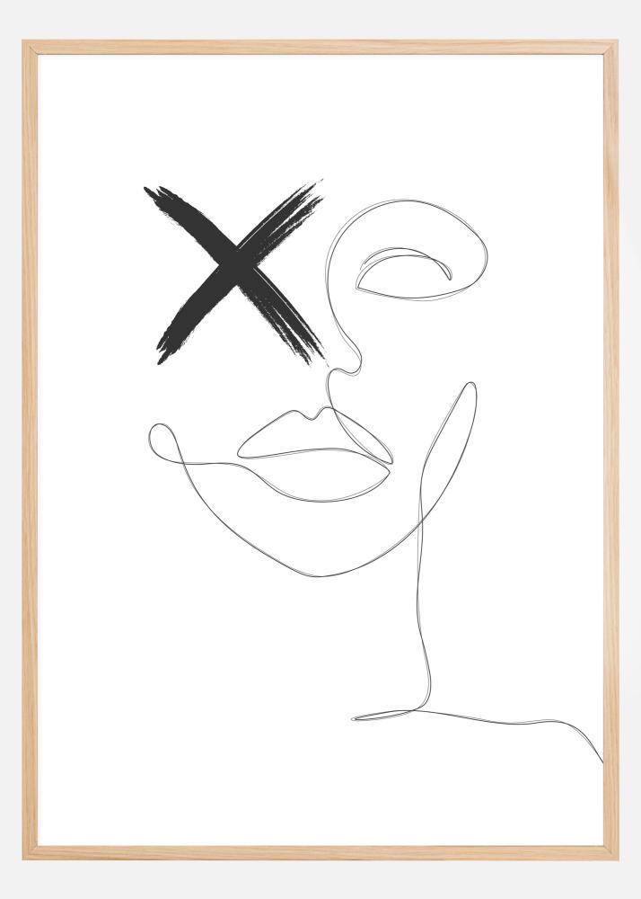 Abstrakcyjny plakat z twarzą narysowaną cienką czarną linią na białym tle. Linia łączy się w płynny ruch, aby narysować twarz. Nad jednym okiem narysowany jest duży czarny krzyż. Powieś go na kolorowej ścianie, aby był interesującym tematem do rozmowy.