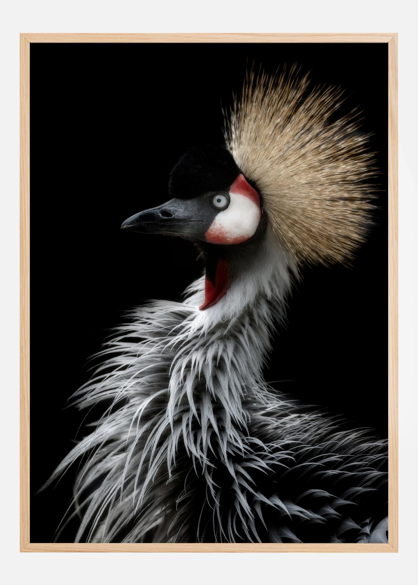 Wspaniały plakat z dzikiej przyrody z żurawiem na czarnym tle. Białe pióra i puszysty żółty grzebień wyróżniają się dramatycznie, tworząc królewski efekt. Czerwone i białe wzory przyciągają wzrok do oka ptaka. Podziwiaj, jak wspaniała jest natura dzięki temu niesamowitemu portretowi ptaka.