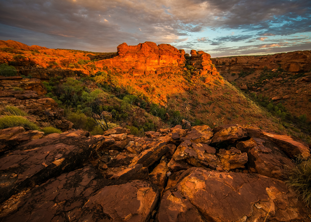 Plakat z fotografią surowych czerwonych gór o zachodzie słońca, coś dla miłośników pustyń i formacji skalnych do powieszenia na ścianie. Ciepłe czerwone tony na tle lodowoniebieskiego nieba i głębia obrazu tworzą interesujący motyw. Opraw plakat w elegancką ramę fotograficzną i umieść na ścianie z innymi motywami pustynnymi.