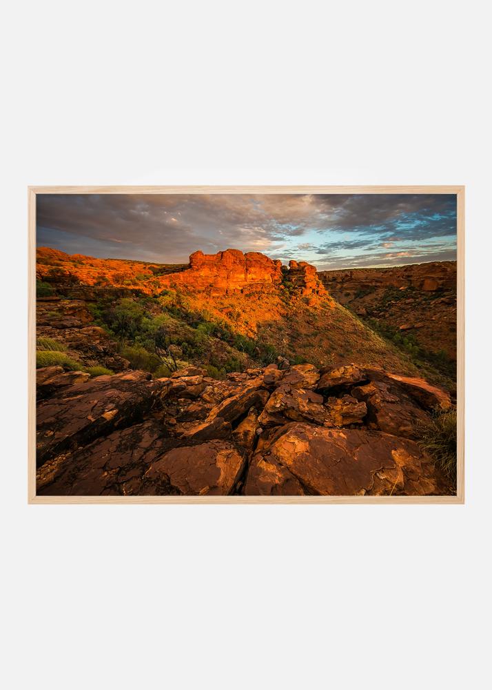 Plakat z fotografią surowych czerwonych gór o zachodzie słońca, coś dla miłośników pustyń i formacji skalnych do powieszenia na ścianie. Ciepłe czerwone odcienie w kontraście z lodowoniebieskim niebem oraz głębia zdjęcia tworzą interesujący motyw. Opraw plakat w elegancką ramę fotograficzną i umieść na ścianie z innymi motywami pustynnymi.