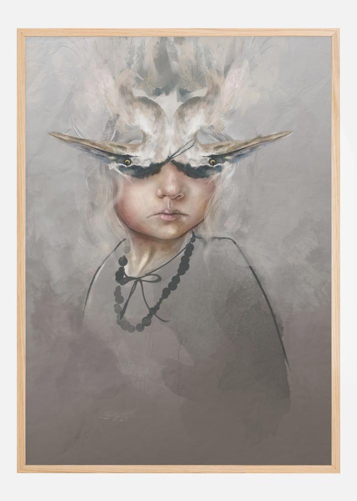 Upiorny plakat z osobą spowitą w dymie. Głowa jest pokryta kapeluszem, który zdaje się płonąć i wygląda jak dwa odwrócone ptaki lub czaszka. Oczy są tajemniczo zacienione, a osoba emanuje mistycznym spokojem. Powieś to dzieło w swoim domu i umożliwiaj dalsze interpretacje.