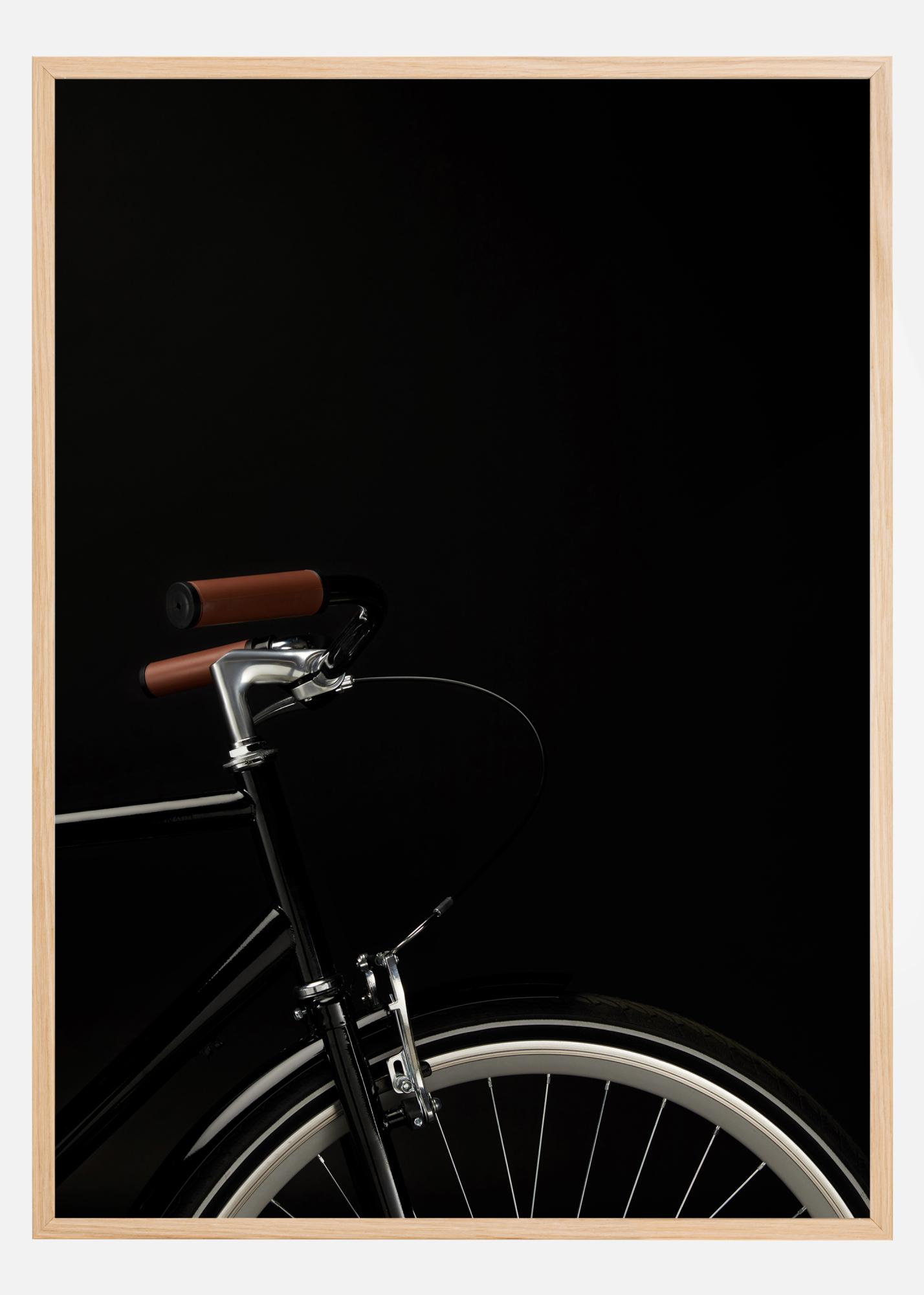Dramatyczny plakat z górną połową roweru na solidnym czarnym tle. Brązowe uchwyty kierownicy, błyszcząca chromowana rama i biała opona wyróżniają się mocno na tle czerni. Dla entuzjasty rowerów ten obrazek to absolutna konieczność.