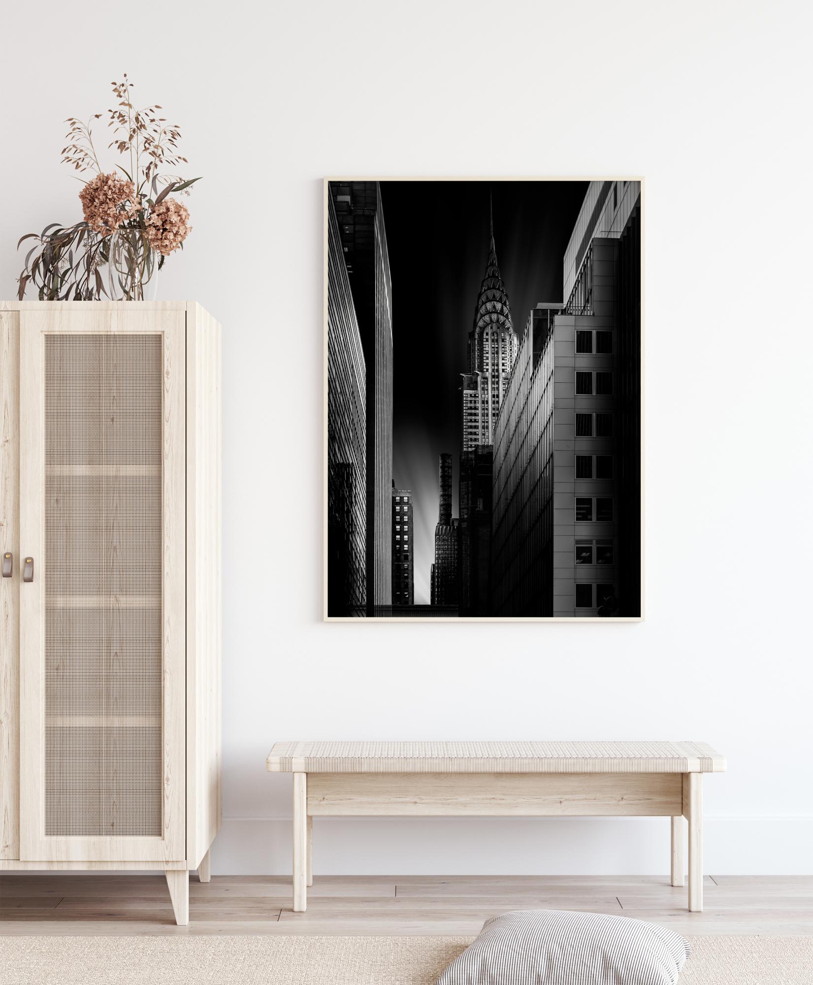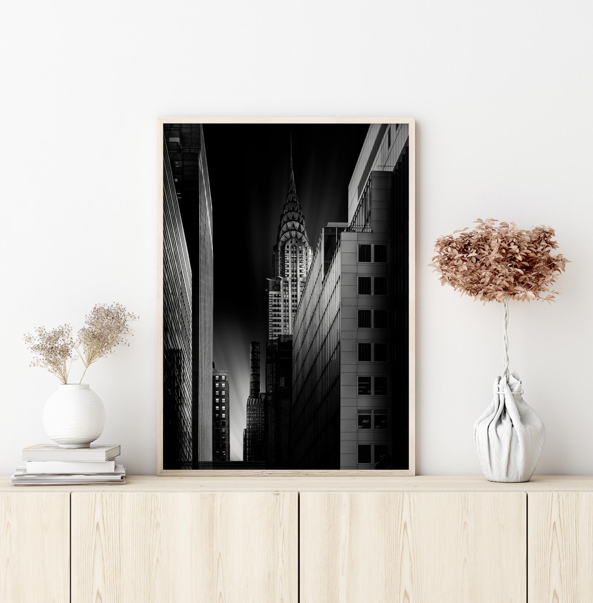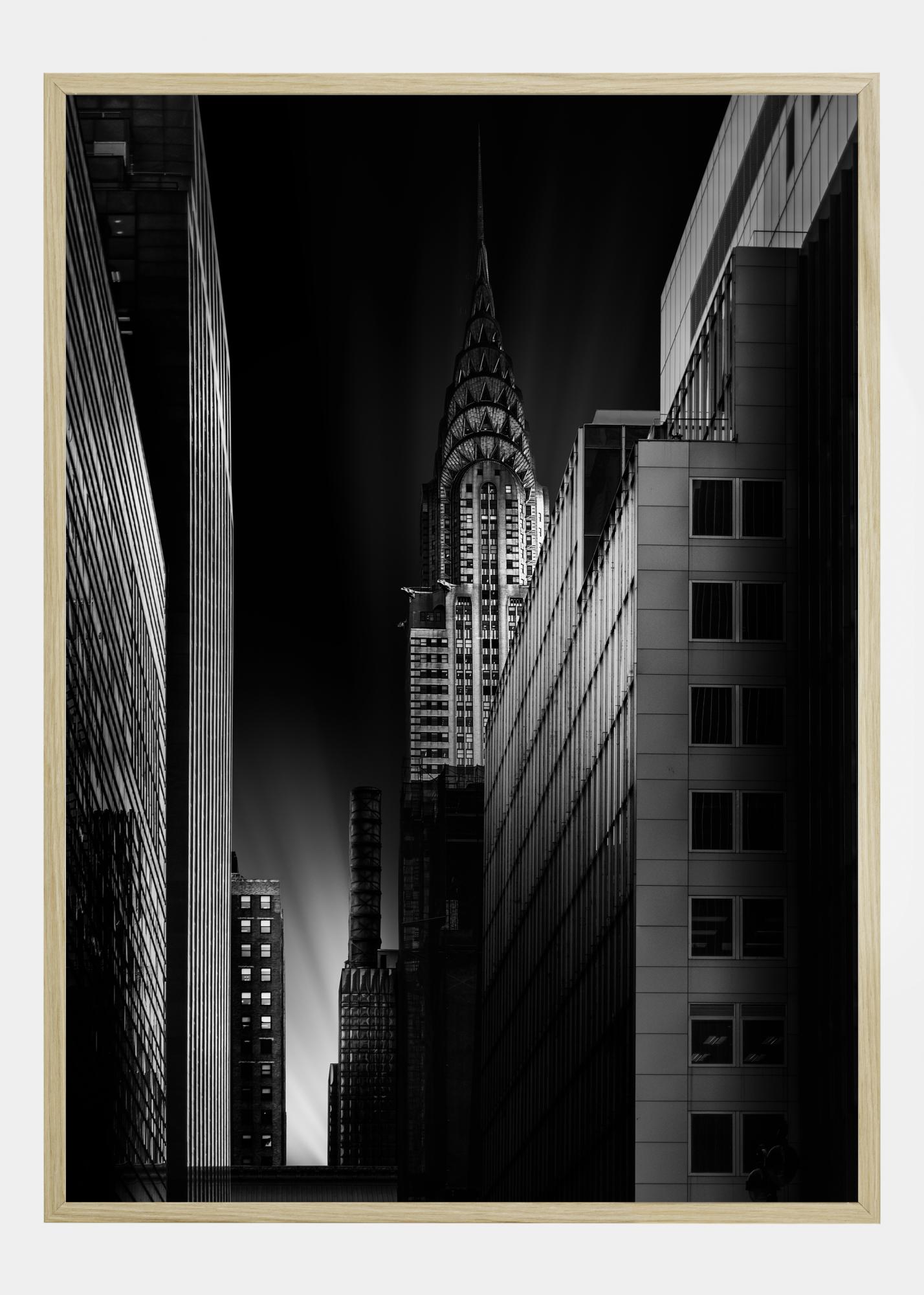 Miejski plakat z budynkiem Chryslera nocą. Wąska ulica prowadzi wzrok w dół do błysku światła na niebie. Po prawej stronie można zobaczyć zacieniony budynek na tym nieco upiornym zdjęciu. Plakat zawieszony na białej ścianie w prywatnej galerii.