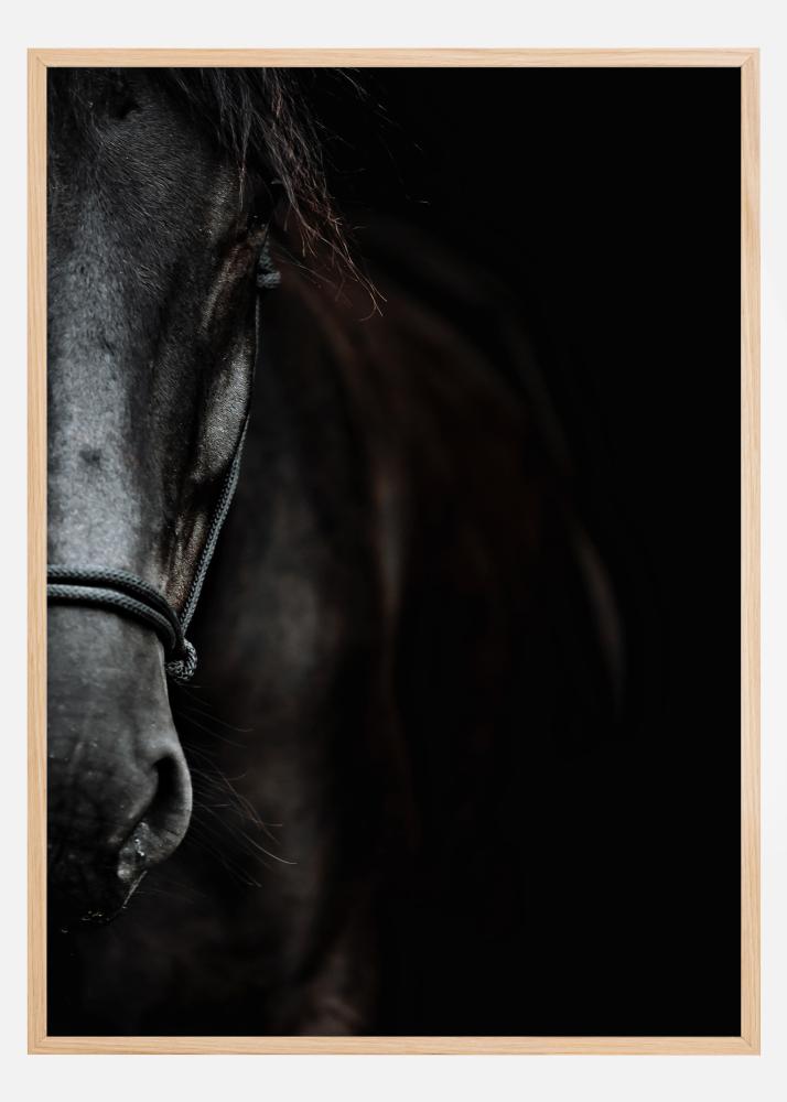 Plakat fotograficzny dla miłośnika koni! Oto ciemny koń sfotografowany z przodu na ciemnym tle. Twarz jest pięknie oświetlona, podczas gdy tylne części konia wtapiają się w tło. Uzupełnij chętnie czymś z naszego dużego asortymentu ramek.