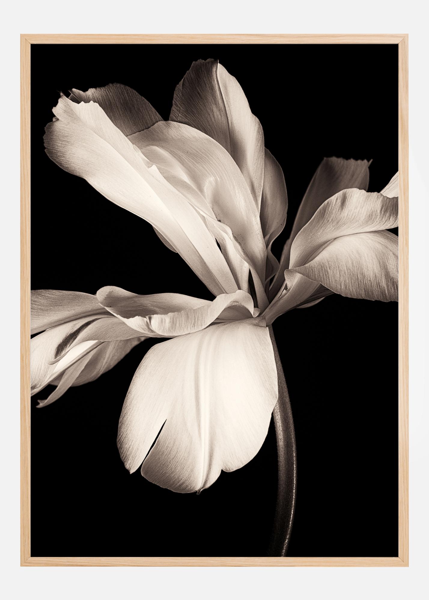 Plakat makro z kwiatem i jego płatkami. Miękki, blady biały płatek zwija się i składa nad silną łodygą na prostym czarnym tle. Obiektyw makro uchwyca wszystkie szczegóły, co czyni go idealnym wyborem dla miłośnika kwiatów. Podziwiaj szczegóły na tym obrazie.