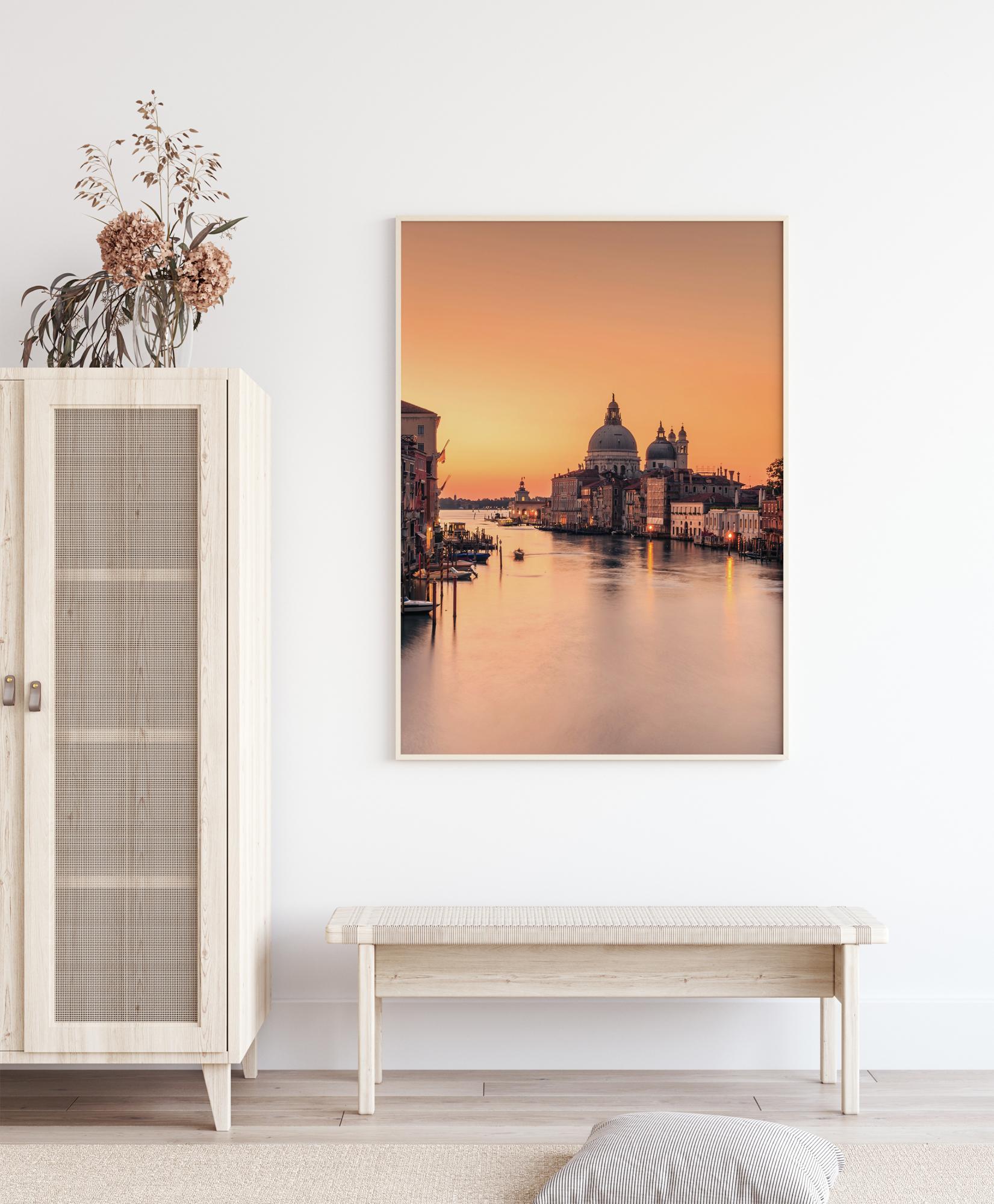 Plakat z panoramą miasta przedstawiający świt w Wenecji. Szeroki kanał otwiera się na morze z miastem wzdłuż każdego brzegu. Niebo jest wspaniałe pomarańczowe, gdy słońce wschodzi nad katedrą. Poczuj ciepło nowego dnia dzięki temu pięknemu i spokojnemu obrazowi.