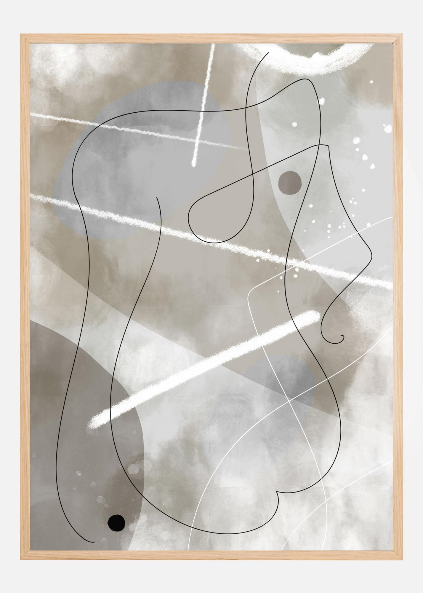 Abstrakcyjny plakat z twarzą o delikatnych liniach. Za cienkimi liniami twarz ma zamglone, eteryczne niebieskie i szare tło. Inne abstrakcyjne linie i kształty przepływają, czyniąc to dzieło bardziej złożonym. Odkryj ten obraz w zaciszu swojego domu.