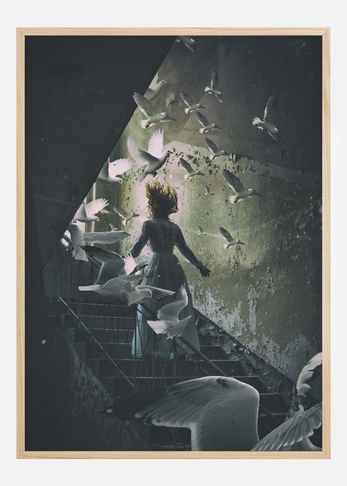 Przyjemny plakat z dziewczyną wchodzącą po schodach z ptakami w białe ptaki krążącymi wokół głowy. Szarozielone ściany są jaśniejsze wyżej. Białe gołębie latają i wirują we włosach dziewczyny. Podążaj za tą panną, gdy idzie w kierunku światła wśród ptaków.
