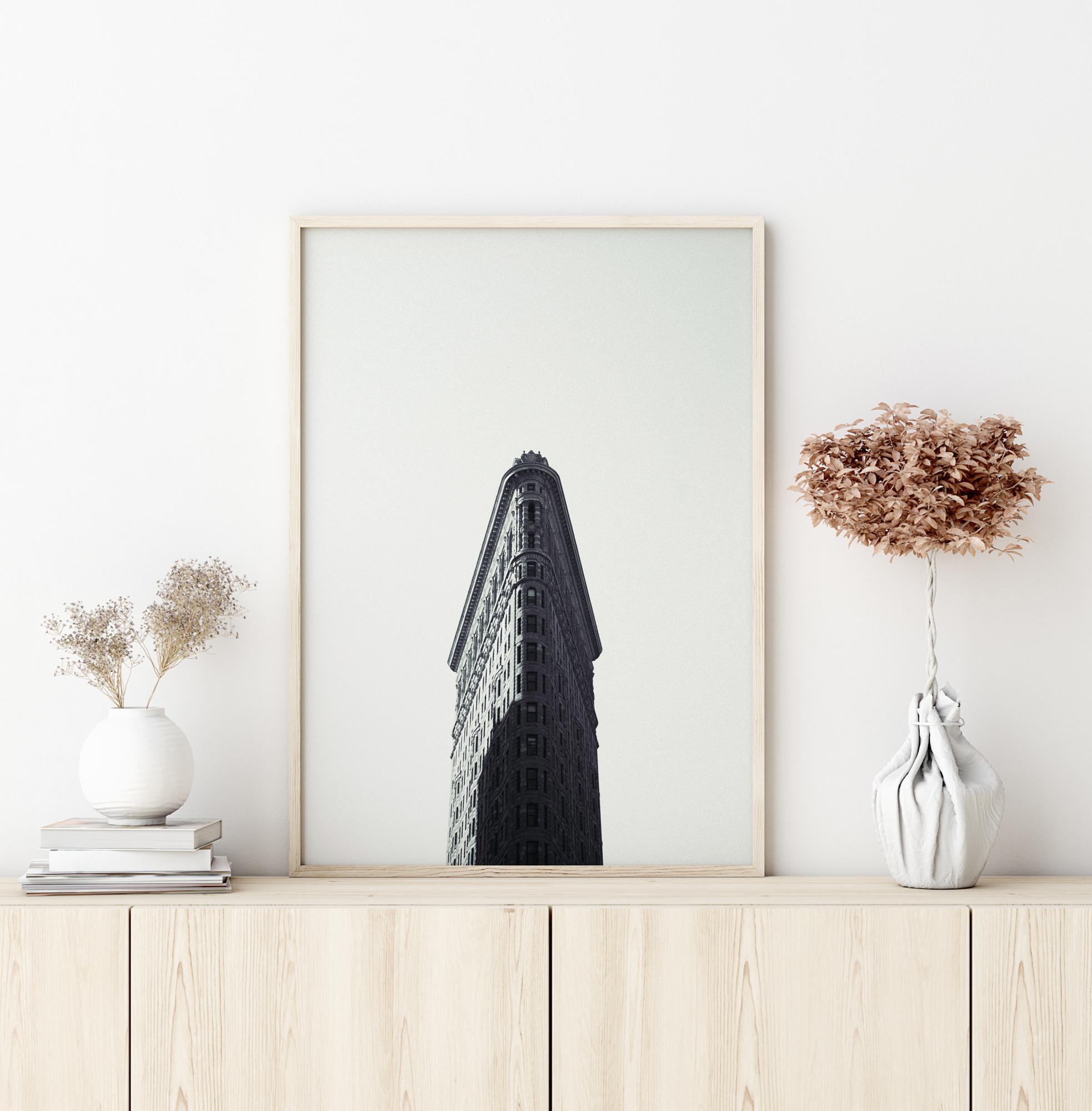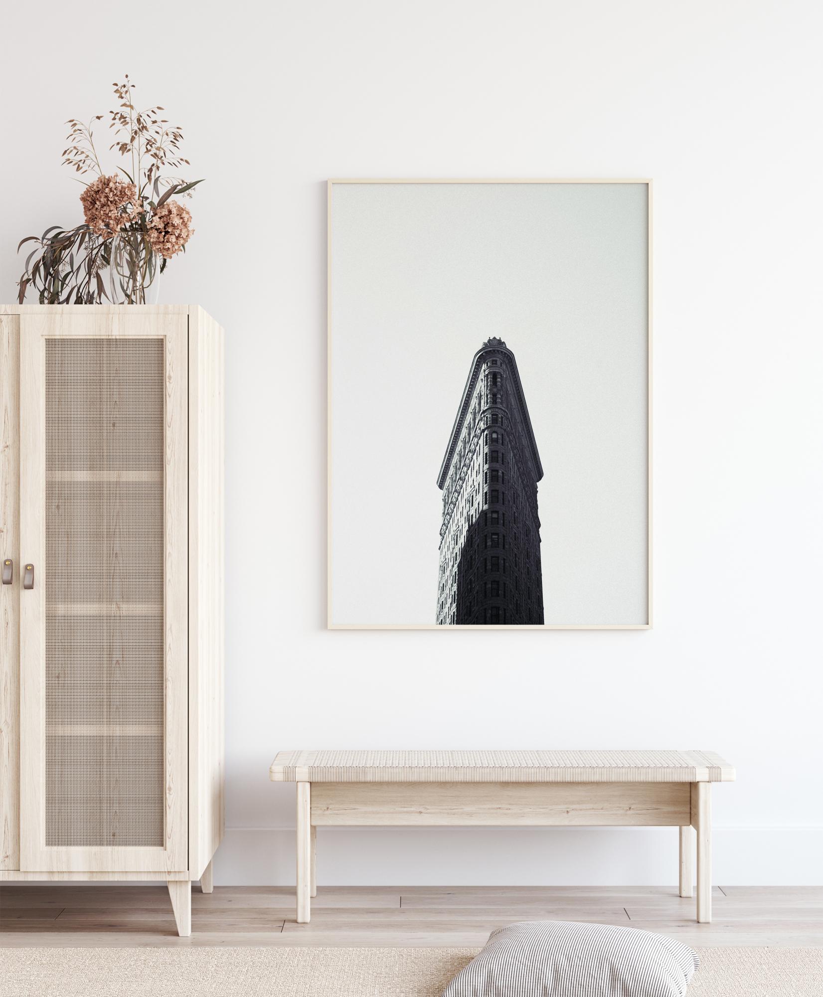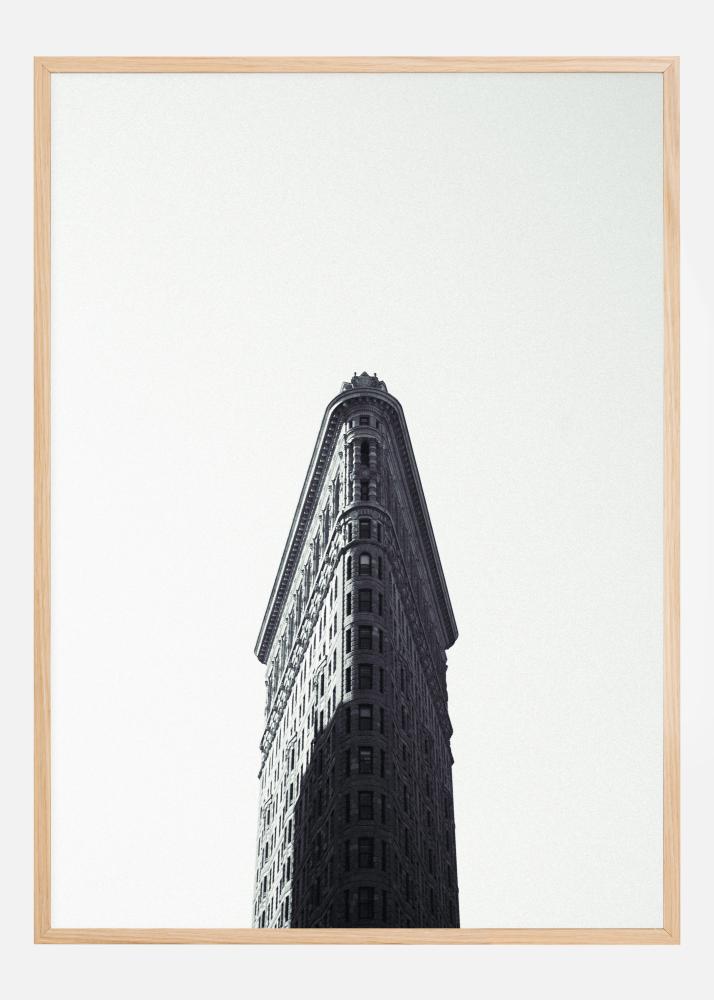 Plakat architektoniczny przedstawiający przedni narożnik starego bloku mieszkalnego. Przód budynku wygląda jak dziób statku, co stanowi silny kontrast do białego nieba. Trójkątny kształt przyciąga wzrok i prowadzi go w górę budynku. Powieś ten obraz na jednokolorowej ścianie, aby stworzyć artystyczną atmosferę.