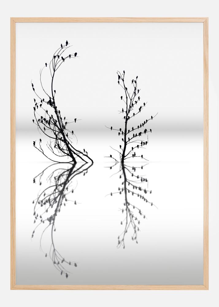 Stylizowany plakat z dwiema gałęziami wystającymi z wody. Ciemne gałęzie, które są zgięte i skręcone, rzucają swoje odbicia na spokojną wodę poniżej. Stonowane odcienie niebieskiego i białego w tym dziele tworzą spokojną atmosferę, którą możesz się cieszyć, mając ten obraz na ścianie w domu.