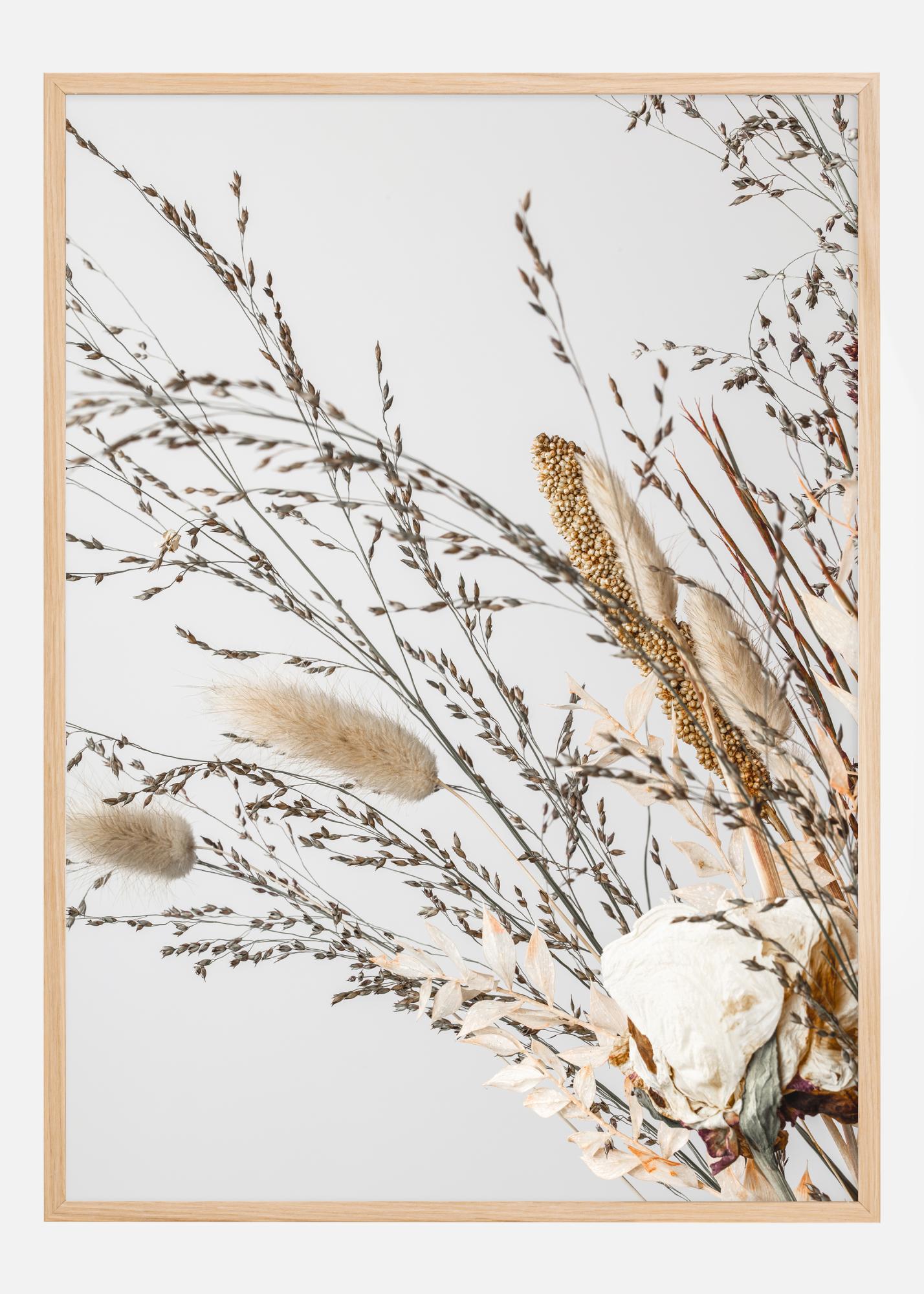 Ten plakat jest celebracją cichej elegancji natury, przedstawiającą zróżnicowaną aranżację suszonych roślin. Naturalna kompozycja jest pełna delikatnych linii i organicznych form, od kołyszących się źdźbeł traw po solidne kłosy i subtelnie tonowane liście. Paleta brązowo-beżowa suszonych roślin na czystym białym tle daje poczucie ciepła i natury uchwyconego w spokoju.