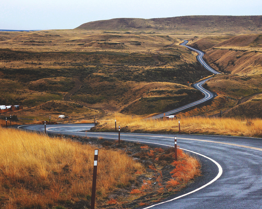 Plakat z asfaltową drogą wijącą się przez słoneczny stepowy krajobraz. Żółtobrązowe odcienie trawy w kontraście do zimnej powierzchni asfaltu, która przecina otwarty krajobraz, przyciągają wzrok do obrazu i prowadzą wzrok wzdłuż drogi. Plakat dobrze prezentuje się w minimalistycznej ramce, gdzie motyw może pokazać swoje walory i może być łączony z innymi obrazami w temacie.