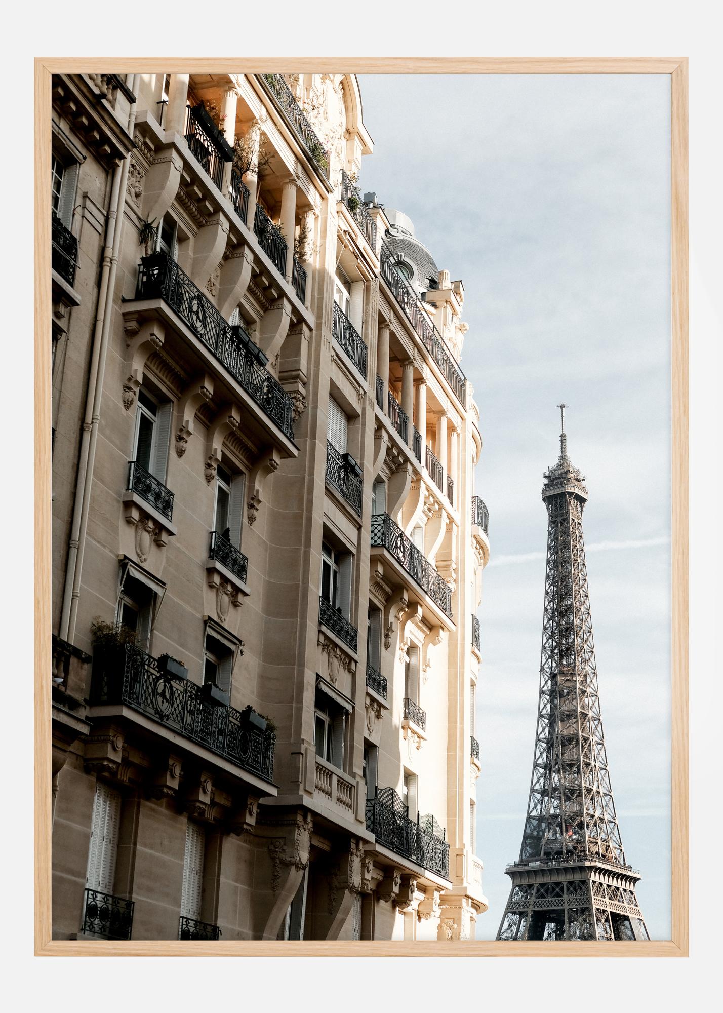 Ten plakat przedstawia klasyczny widok Paryża, gdzie Wieża Eiffla dumnie wznosi się za typowymi dla miasta kamienicami z kutymi balkonami i rzeźbionymi detalami fasad. To scena oddająca paryską atmosferę i elegancję, idealna do wprowadzenia francuskiego stylu do każdego domu. Obraz uchwyca idealną równowagę między architektonicznymi perełkami miasta a otwartą przestrzenią nieba, co daje poczucie przestrzeni i wolności, która jest synonimem duszy Paryża.