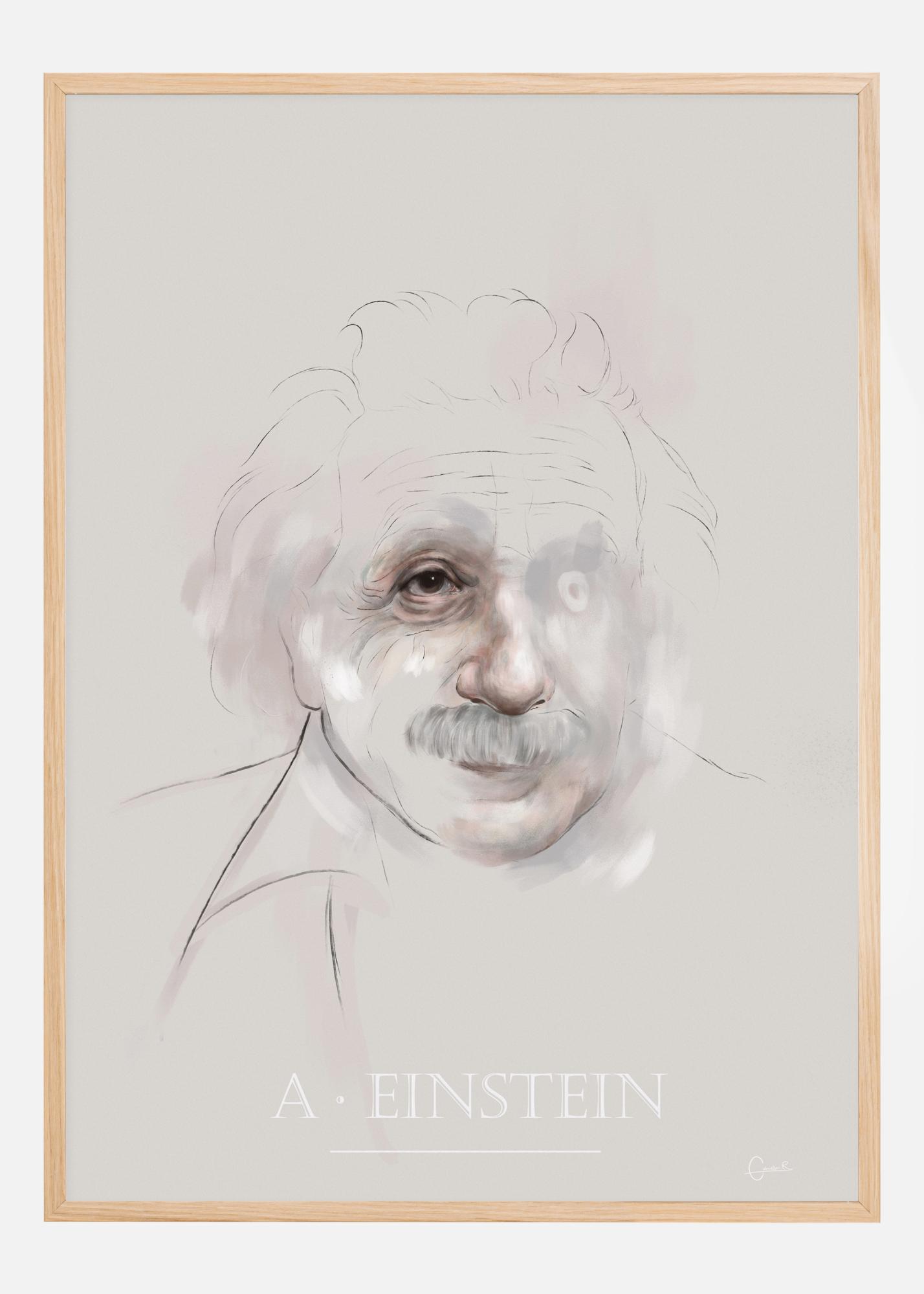 Plakat Einsteina przedstawiający szybki szkic ekscentrycznego naukowca. Subtelne linie tworzą część jego twarzy, ale tylko jedno oko, nos i wąsy są szczegółowe, przez co Einstein wyłania się z plakatu. Zainspiruj się jego przyjaznym spojrzeniem, gdy na ciebie patrzy.