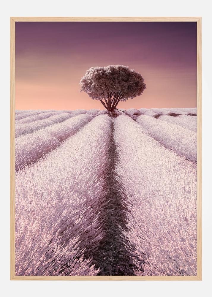 Wejdź do świata marzeń przepełnionego kolorem i fantazją dzięki naszemu ekskluzywnemu plakatowi. Ten wydruk emanuje magicznym uczuciem dzięki pastelowemu niebu, które przechodzi z ciepłych różowych do kojących fioletowych odcieni. Motyw uwydatnia samotne drzewo, majestatycznie usytuowane wzdłuż czystej linii ścieżki na polu lawendowym. Ten plakat jest wizualną ucztą dla oczu i doskonale pasowałby jako centralny obraz w każdym pomieszczeniu, dodając odrobinę spokoju i piękna.