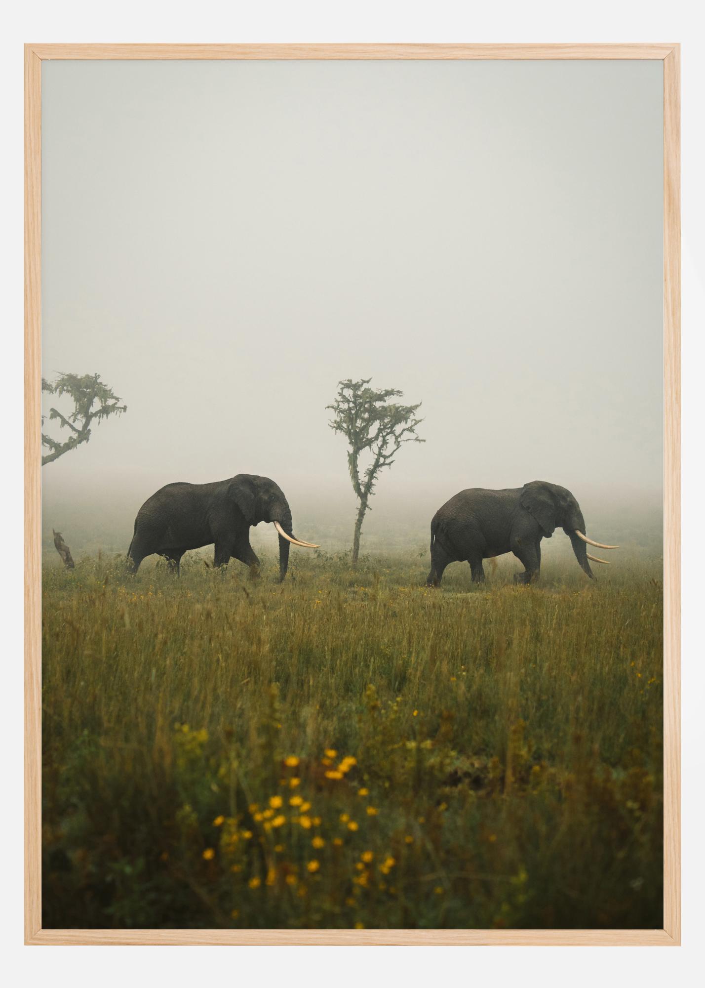 Fotografia przyrody przedstawiająca parę słoni wędrujących w wysokiej trawie pomiędzy surowymi drzewami. Gęsta mgła w tle tworzy ostre kontrasty, które wyjątkowo wyraźnie uwydatniają te duże zwierzęta. Plakat dla miłośników sawanny i jej największych mieszkańców!