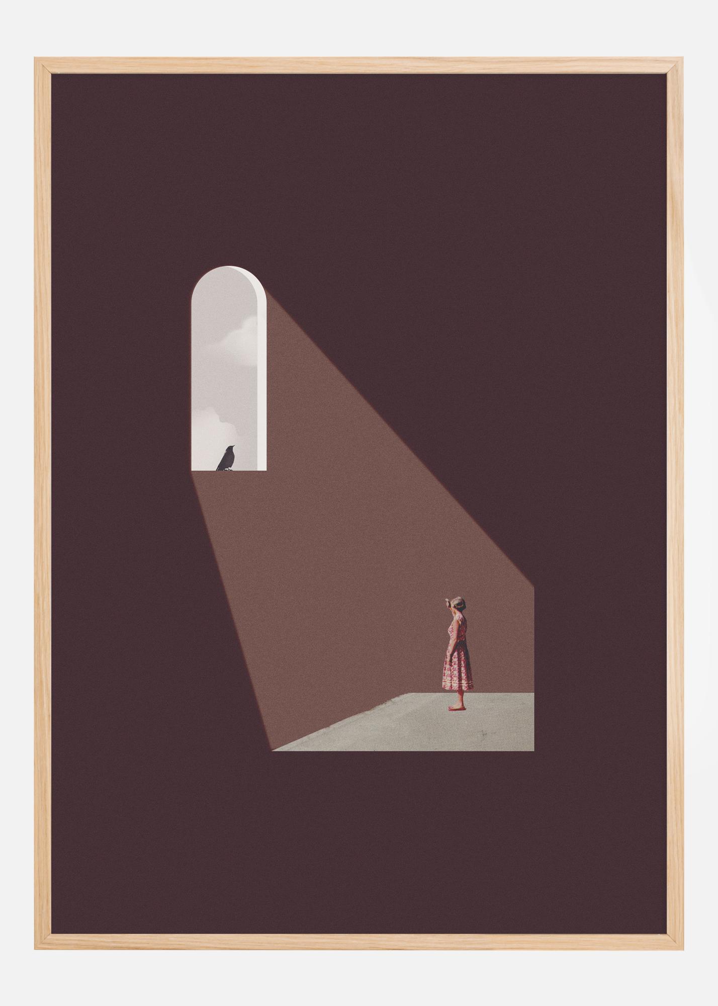 Ten minimalistyczny plakat uchwyca spokojną chwilę zadumy. Pojedyncza postać stoi w promieniu światła wpadającego przez okno, symbolizując oświecenie i refleksję. Obraz jest nasycony miękkimi brązowymi i beżowymi tonami, tworzącymi ciepłą i przyjemną atmosferę.