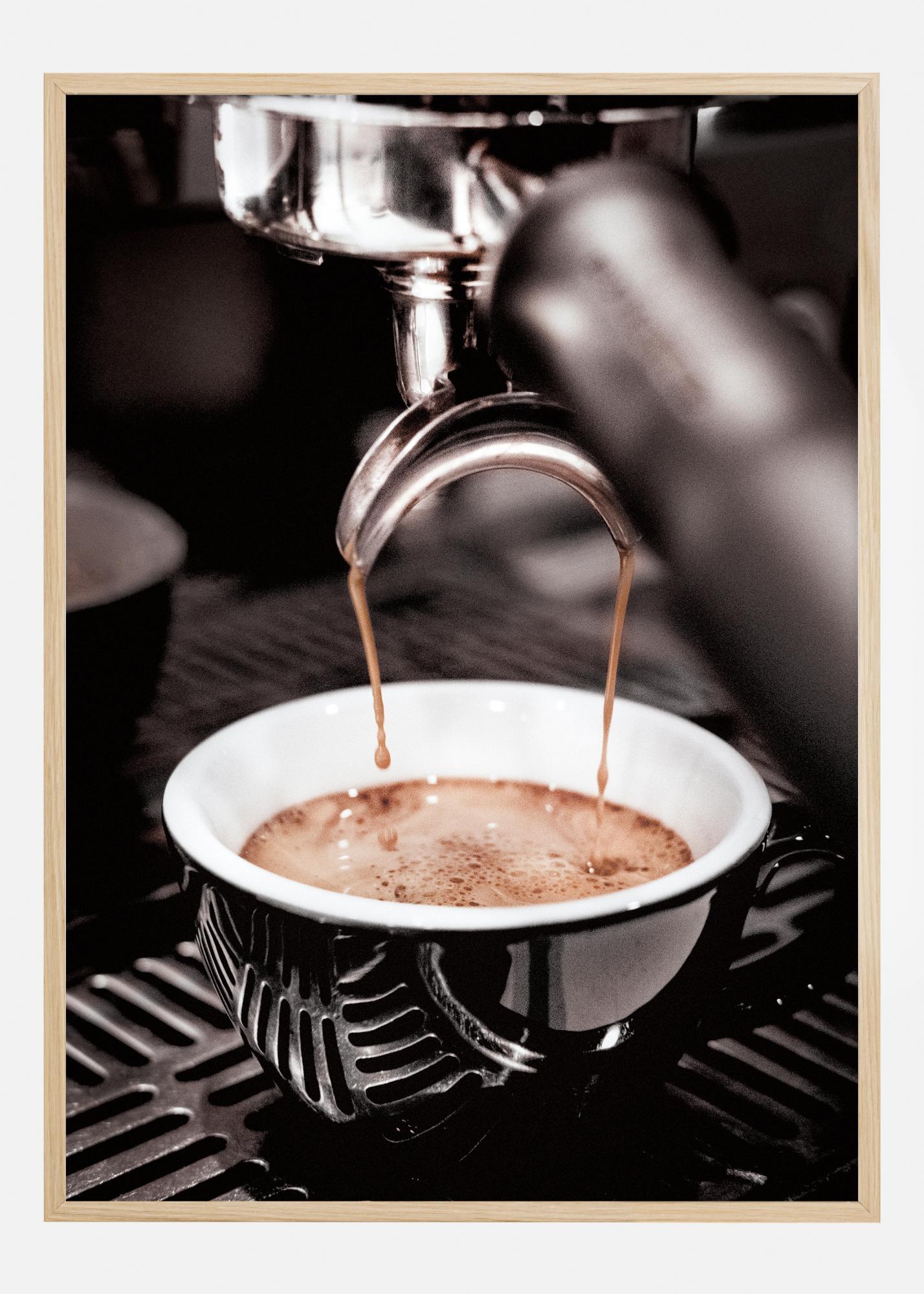 Ten plakat uchwyca niemal zmysłową chwilę doskonałego parzenia espresso, gdzie złocisto-brązowe krople kawy spotykają się z porcelanowobiałą filiżanką w intymnym tańcu. To oda do miłośników kawy i koneserów, obraz przekazujący zarówno bogaty aromat, jak i intensywny smak, który oferuje espresso. Selektywny fokus na strumień kawy i filiżankę poniżej, na tle rozmytego tła ekspresu do kawy, tworzy efekt, dzięki któremu widz niemal czuje ciepło i słyszy syk pary.