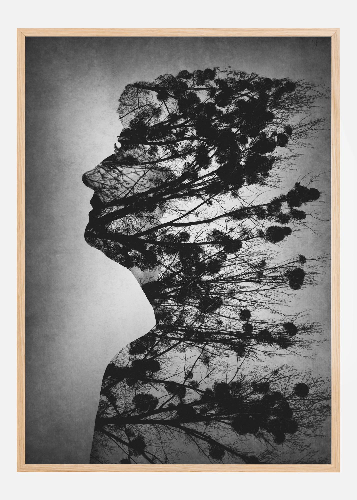 Abstrakcyjny plakat z twarzą kobiety, stworzony za pomocą różnych liści i gałęzi. W fantastycznym czarno-białym, ta dramatyczna poza sprawia, że wydaje się, jakby wiatr zdmuchnął te liście na jej twarz. Mocne podświetlenie podkreśla profil, co nadaje temu mocne, lecz przejrzyste wrażenie.