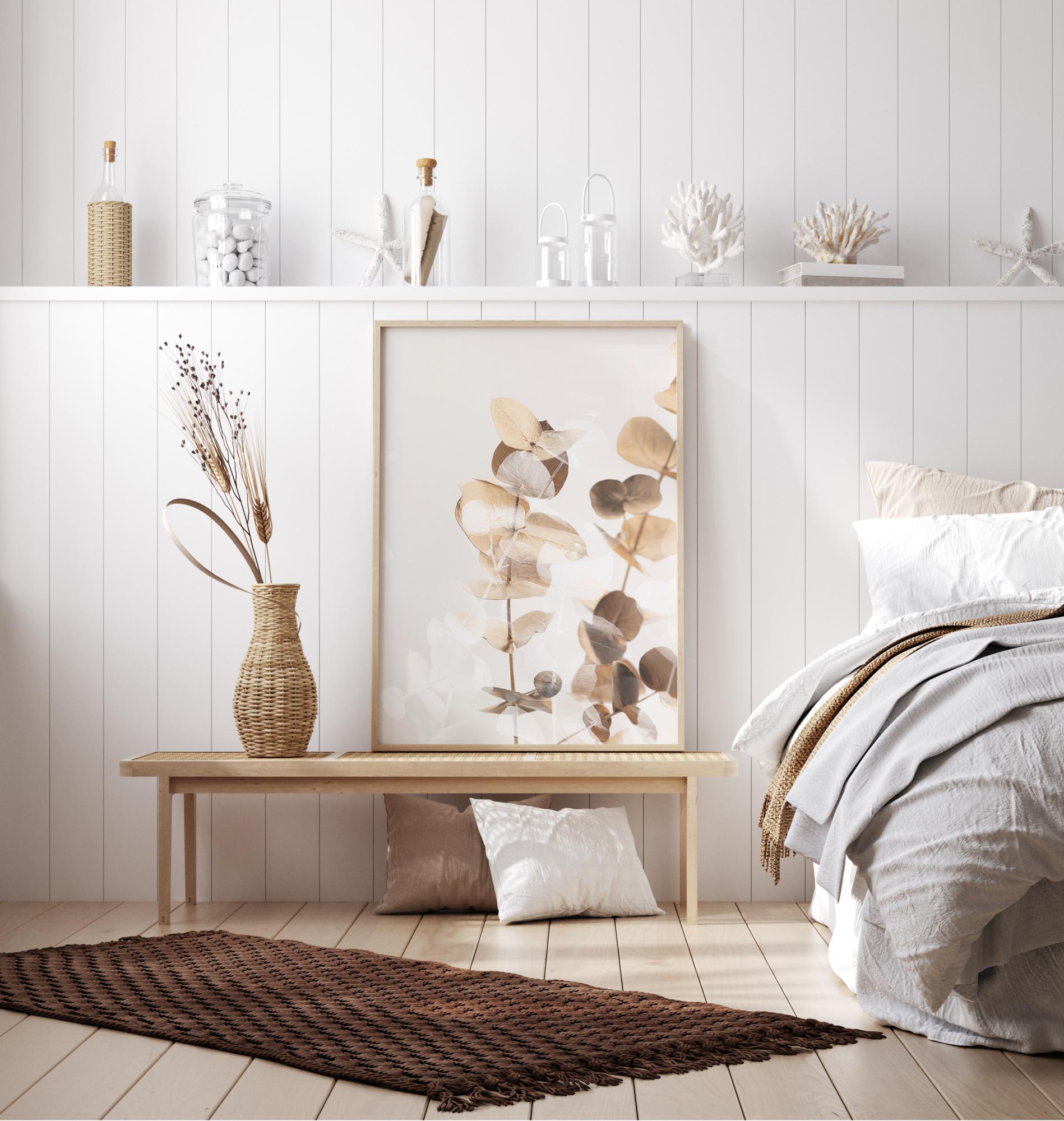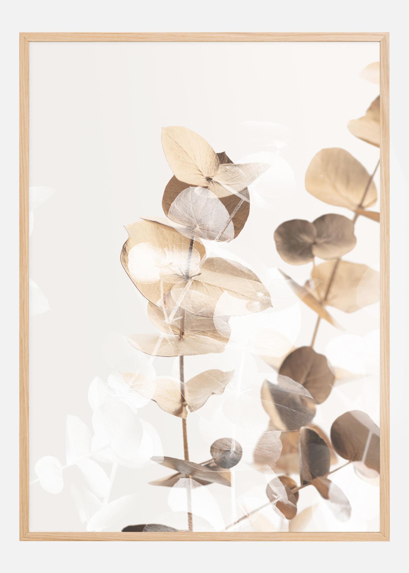 Złoty plakat z liśćmi i gałęziami eukaliptusa. Złote i brązowe liście wyróżniają się lśniącym kształtem na prostym białym tle. Aby wzmocnić te liście, dopasuj z podobną złotą lub ciemno kremową ścianą dla dodatkowej elegancji.