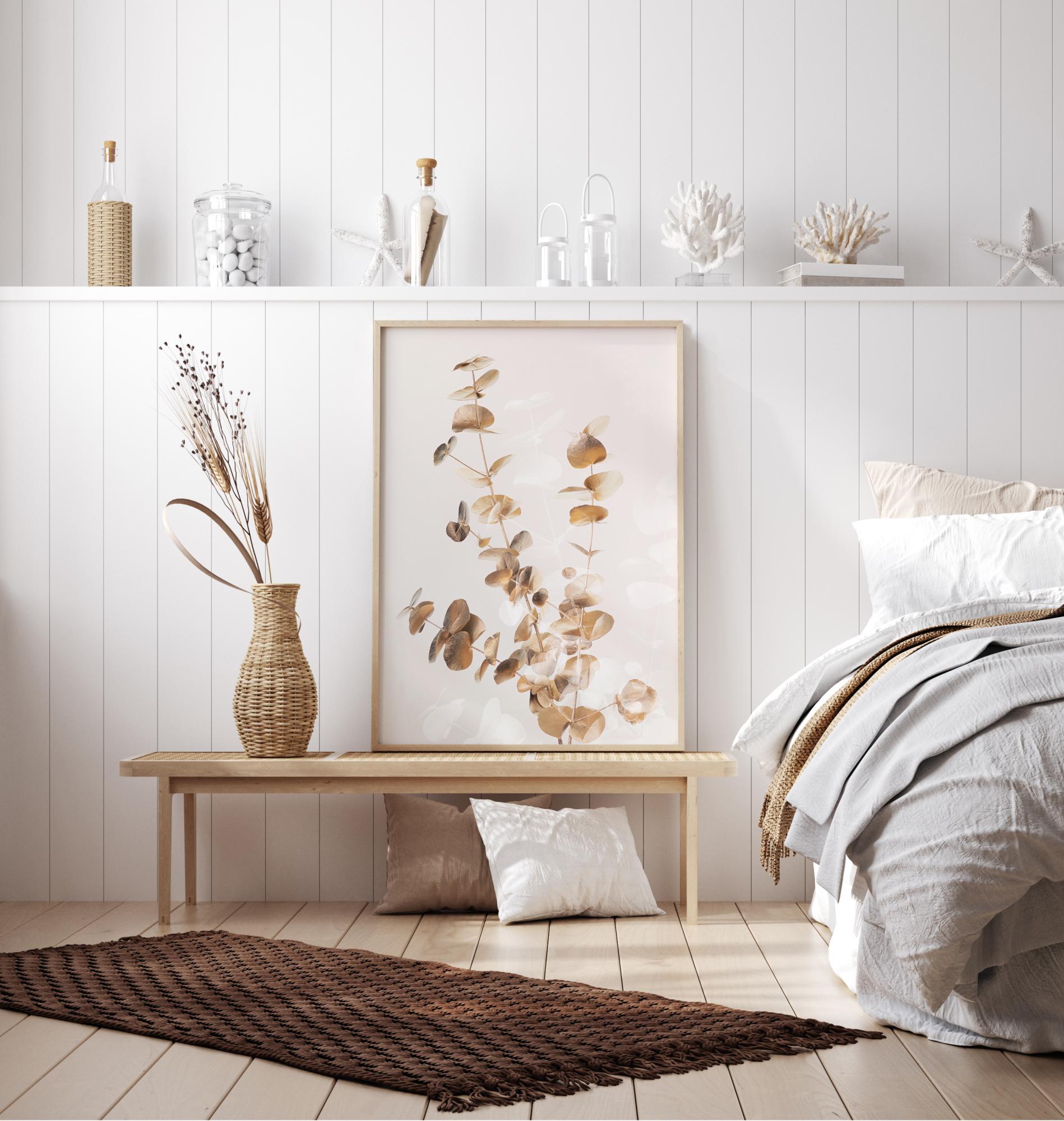 Piękny plakat z gałązkami złotego eukaliptusa. Złote i brązowe liście są delikatne, gdy wystają z białego tła. Liście są okrągłe, co tworzy ładne kształty w obrazie. Ten plakat wprowadza spokojne i stylowe wrażenie do Twojego domu.