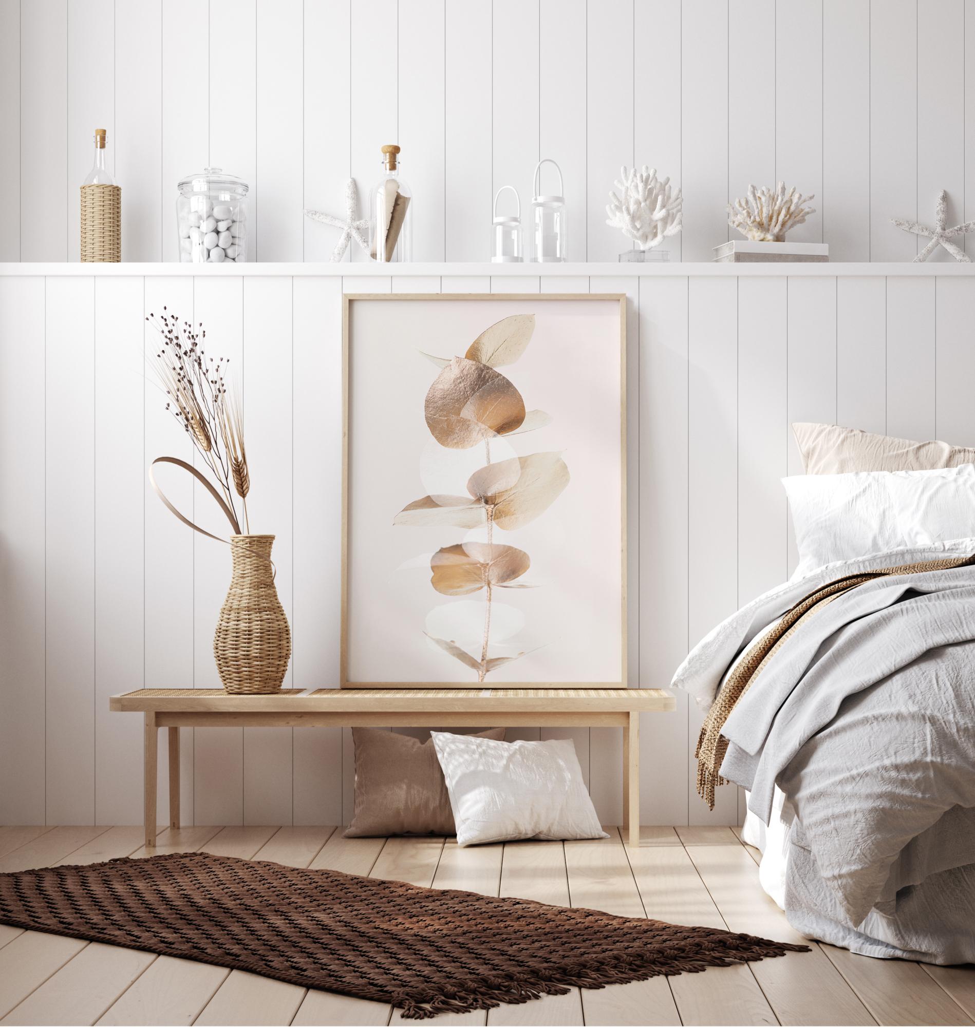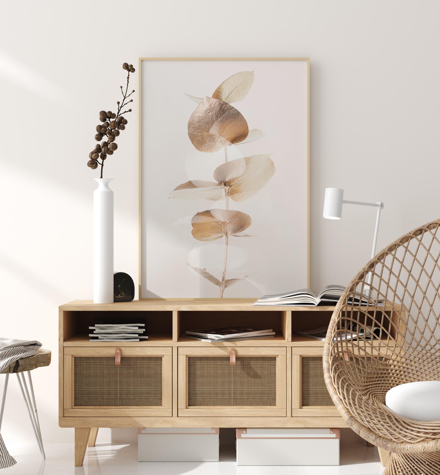 Zbliżenie plakatu z kilkoma złotymi liśćmi eukaliptusa. Prosta elegancja tego obrazu jest wzmocniona przez prostą białą tło. Złote liście delikatnie połyskują, wypełniając plakat swoim miękkim blaskiem, który tworzy poczucie spokoju w domu.