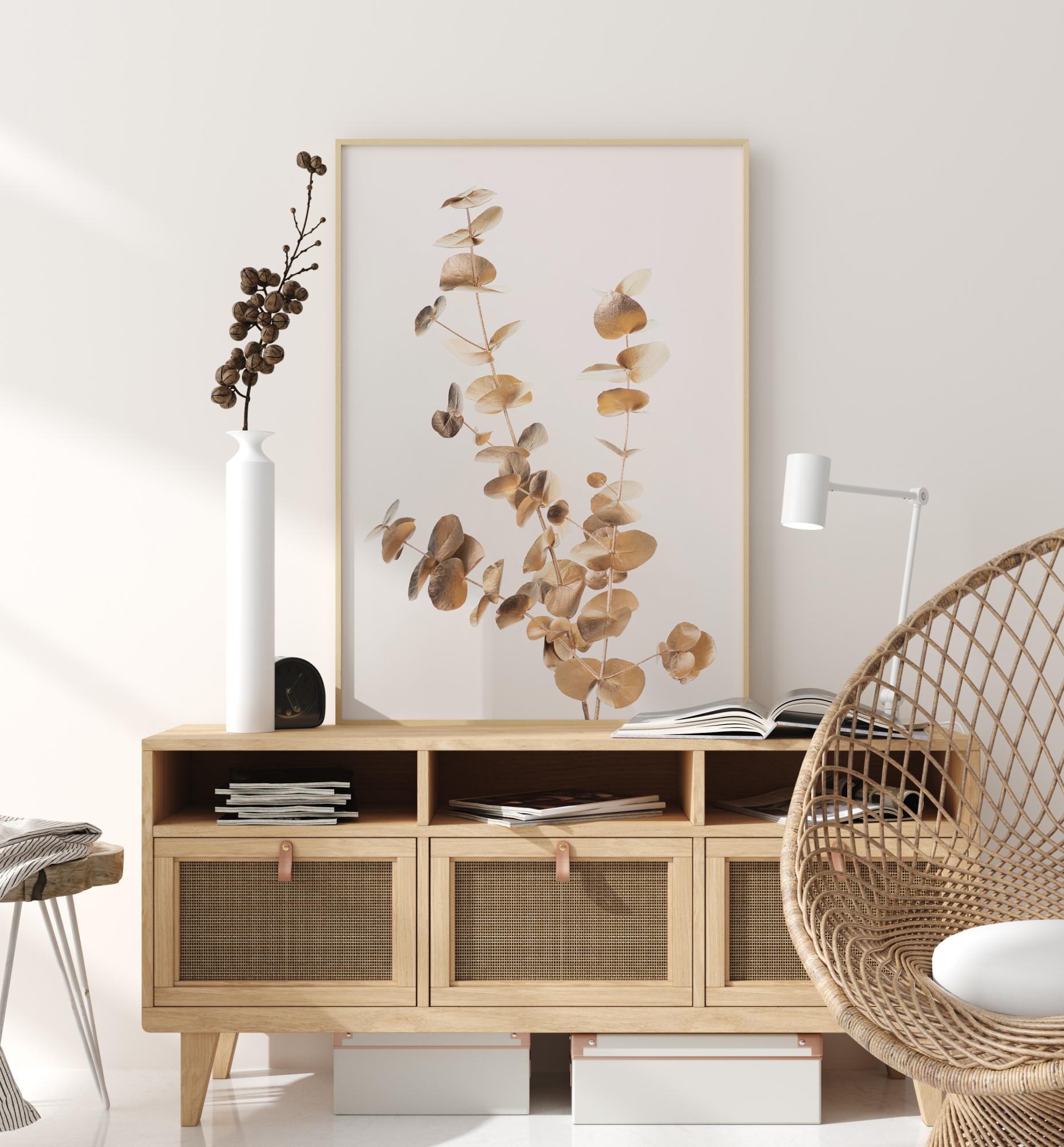 Prosty plakat z kilkoma złotymi gałązkami liści eukaliptusa. Kolory złoty i brązowy są kojące i relaksujące. Gałęzie znajdują się na prostym białym tle, dzięki czemu mocne złoto wyróżnia się dla dramatycznego, ale eleganckiego efektu w twoim domu.