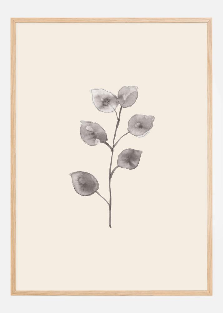 Elegancki plakat z prostym malunkiem gałęzi eukaliptusa. Liście wykonane są w stylu akwarelowym, dzięki czemu są miękkie, a krawędzie prawie się rozmywają. W prostym szarym odcieniu liście wyróżniają się na białym tle. Powieś go na zielonej ścianie, aby dodać koloru.