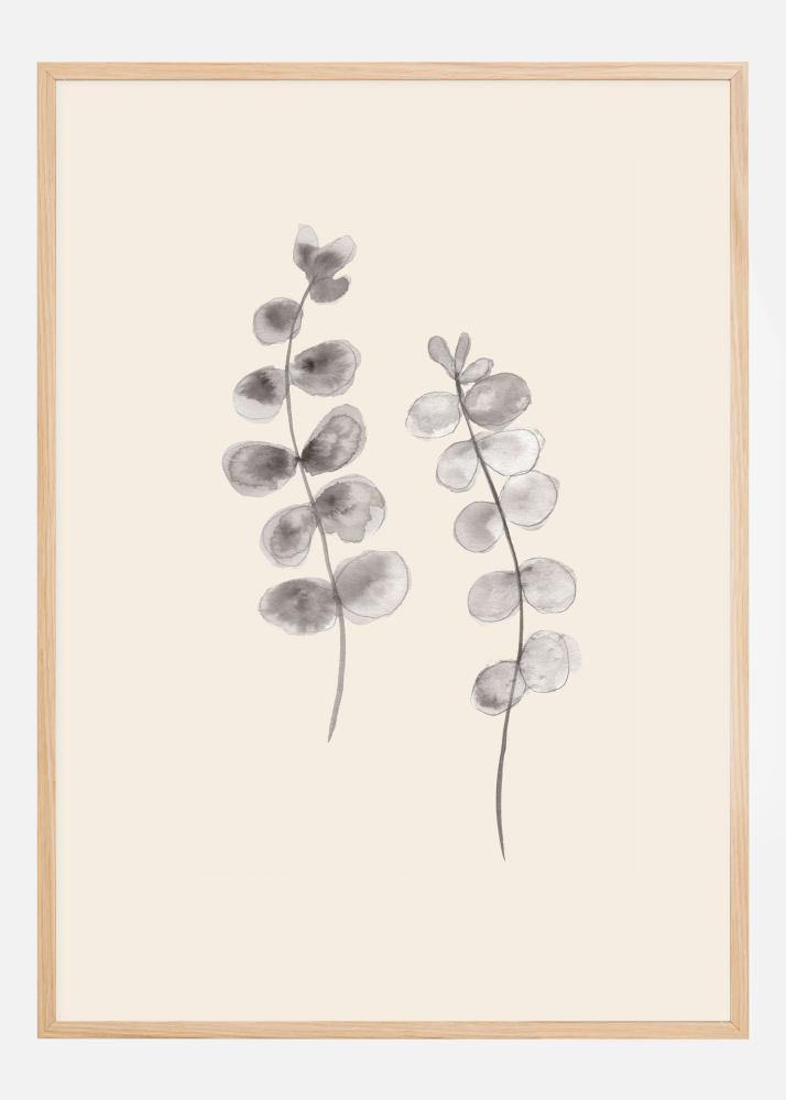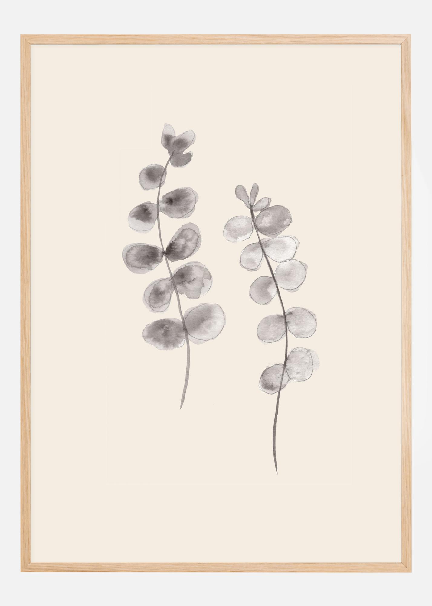 Botaniczny plakat z dwiema szarymi gałązkami z liśćmi eukaliptusa. Na środku białego tła znajdują się dwie szaro malowane gałęzie z liśćmi eukaliptusa. Wyginają się razem, tworząc miękką krzywiznę, która prowadzi wzrok w górę przez plakat. Powieś ten zielony taniec w swoim domu, aby uzyskać kojące uczucie.