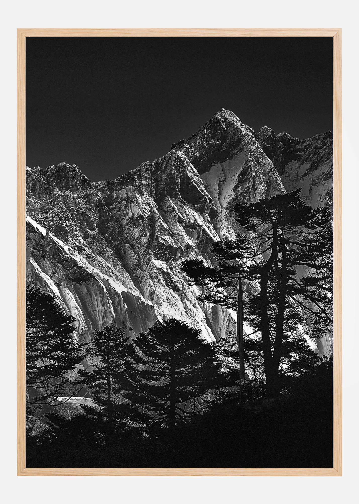 Plakat górski przedstawiający jedną stronę Mount Everest. To dramatyczne czarno-białe zdjęcie pokazuje strome zbocza góry w ostrym świetle. Ciemne drzewa znajdują się na pierwszym planie, a ciemne niebo otacza górę za nimi. Poczuj dramat i niebezpieczeństwo na tym zdjęciu.
