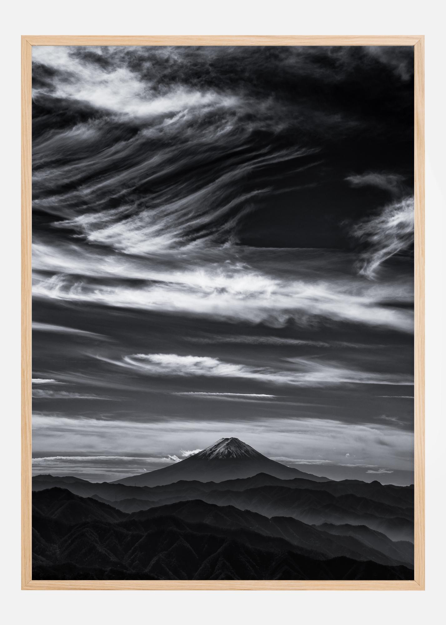 Ten plakat to wspaniała czarno-biała reprezentacja ikonicznej góry Fuji, otoczonej dramatyczną grą chmur i wiatrów na niebie powyżej. Kontrast między ciemnymi, żłobionymi pasmami górskimi a miękkim niebem daje potężne i dynamiczne wrażenie wizualne, które jest zarówno ponadczasowe, jak i urzekające.